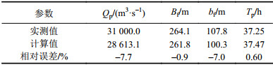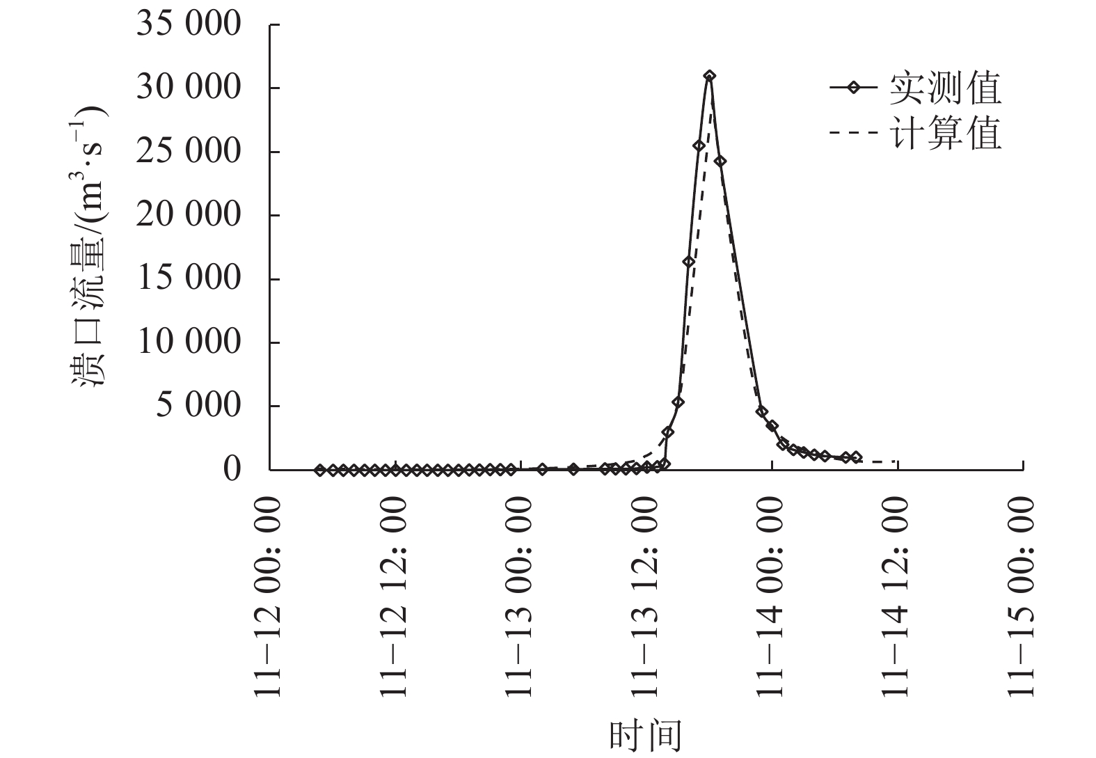 | 图6 溃口流量过程实测值与计算值比较 Fig. 6 Comparison of measured and calculated breach hydrographs |