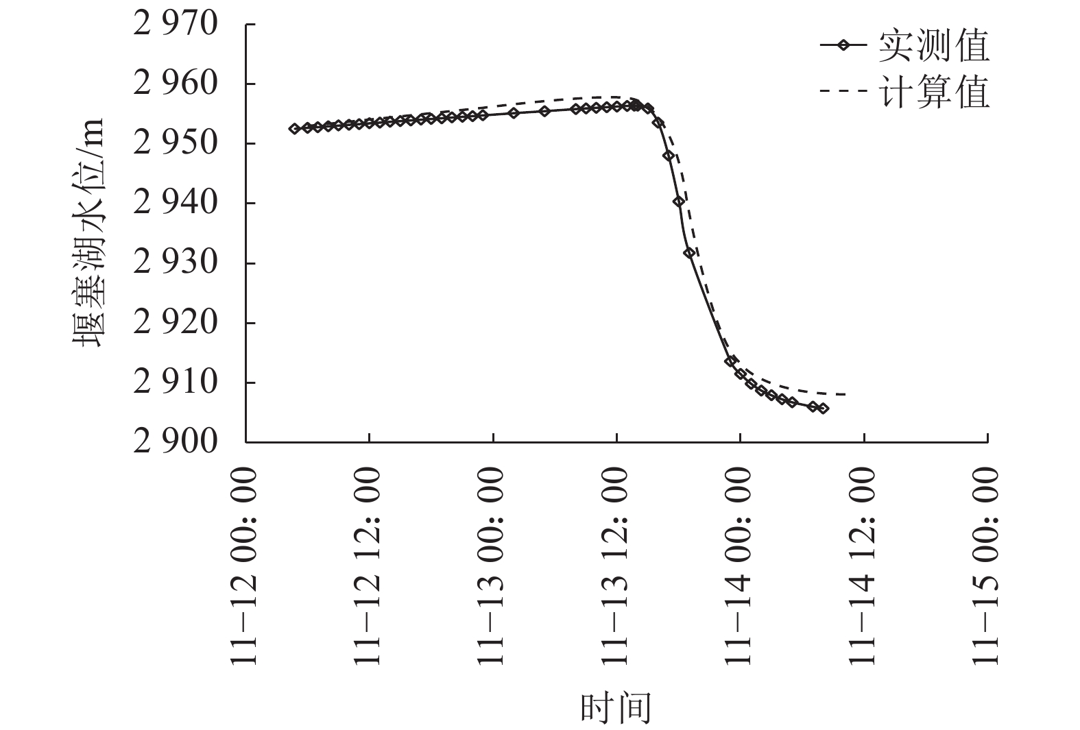 | 图7 堰塞湖水位变化过程实测值与计算值比较 Fig. 7 Comparison of measured and calculated variations of water level in dammed lake |
