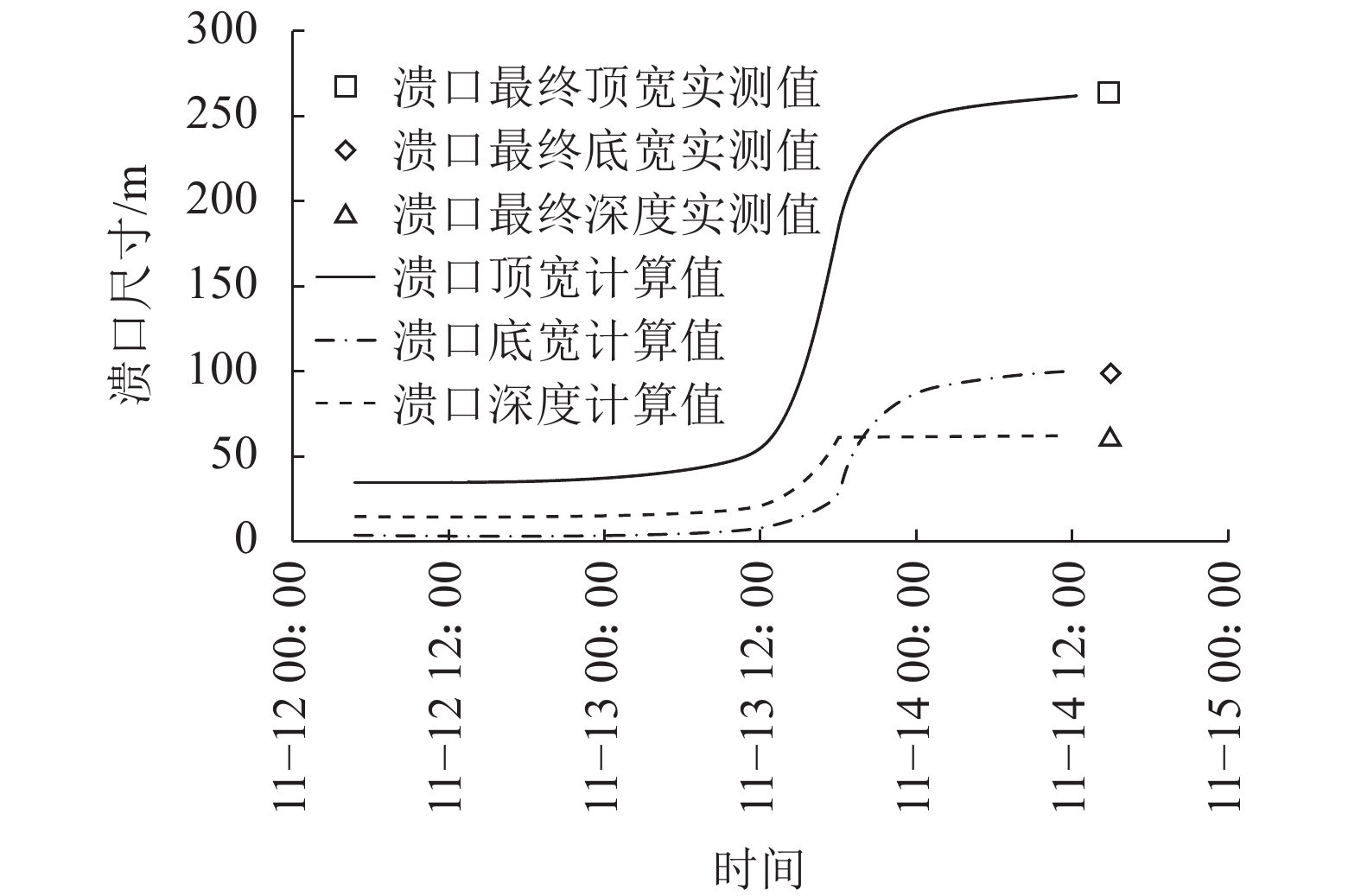 | 图8 溃口发展过程实测值与计算值比较 Fig. 8 Comparison of measured and calculated breach evolution processes |
