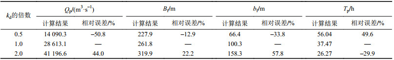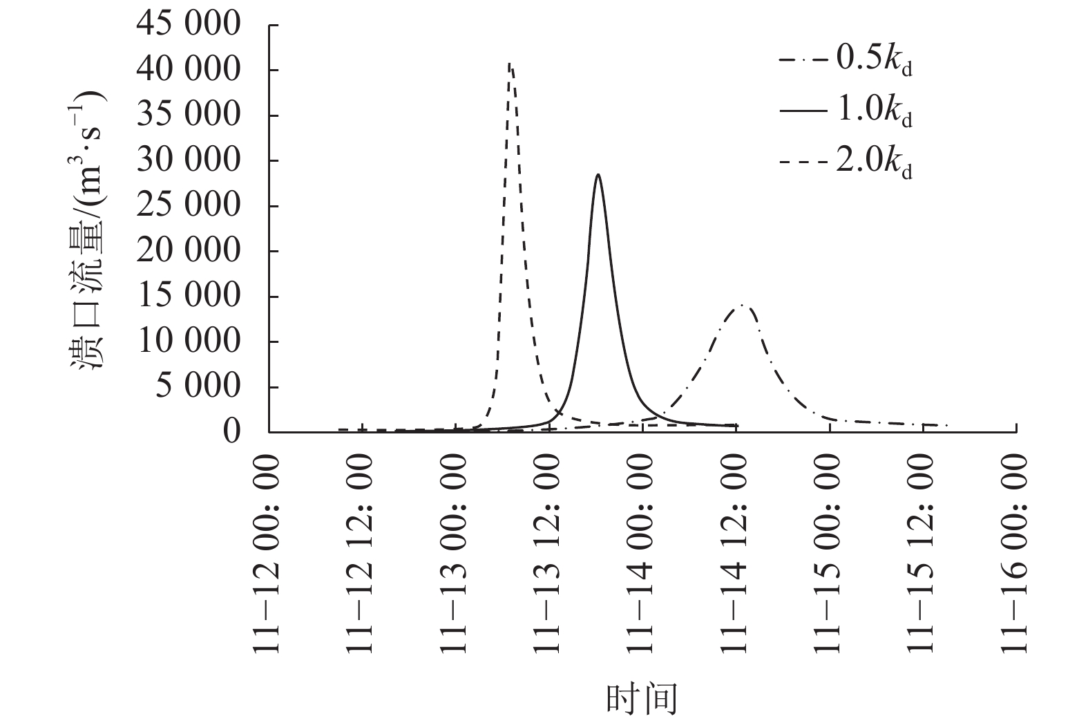 4.1 冲蚀系数敏感性分析为了研究冲蚀系数的敏感性,分别将kd缩小和扩大1倍,其他参数保持不变,然后采用建立的数学模型对“11·3”白格堰塞湖溃决过程进行模拟。冲蚀系数敏感性分析结果见表4,其中相对误差为kd变化后计算结果与原始结果(kd=1.0时)的比较;图9同时给出了不同冲蚀系数情况下的溃口洪水流量过程。通过表4和图9可以看出,堰塞湖溃决各输出参数对冲蚀系数均较为敏感,其中溃口峰值流量最为敏感,说明了冲蚀系数的合理选择对堰塞湖溃决过程模拟的重要性。