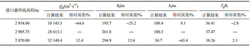 对于堰塞湖的溃决模拟,溃口峰值流量(Qp)、溃口最终顶宽(Bf)、溃口最终底宽(bf)、溃口最终深度(Df)以及溃口峰值流量出现时间(Tp)是重要的输出参数,并且,溃口洪水流量过程线是合理分析堰塞湖溃决洪水下游演进情况和致灾后果评价的重要基础,因此上述参量的准确性是模型合理性的重要依据。下面主要通过对比计算结果和实测结果,验证建立的数学模型的合理性。表3分别给出Qp、Bf、bf和Tp等4个参数的比较情况,由于模型设置了残留坝高,因此不对参数Df进行比较。另外,图6和7对溃口流量过程和堰塞湖水位变化过程的计算值和实测值进行了比较。由于堰塞湖溃决过程中水下的溃口未能测量,故只提供计算获取的溃口发展过程,并与堰塞湖溃决后的实测溃口最终尺寸进行了比较(图8)。值得一提的是,通过联解水量平衡方程与蓄泄关系,搭建静库容调洪演算模型,根据10、15、30 min等不同时间步长的水位变幅,推算多时间尺度的流量过程,长江水利委员会水文局综合获取了最终溃口处的流量过程,并通过搭建动库容调洪演算模型复核了计算结果[26]。