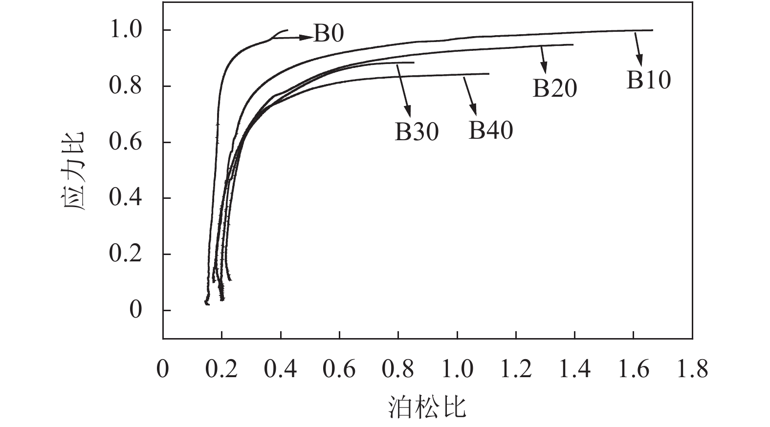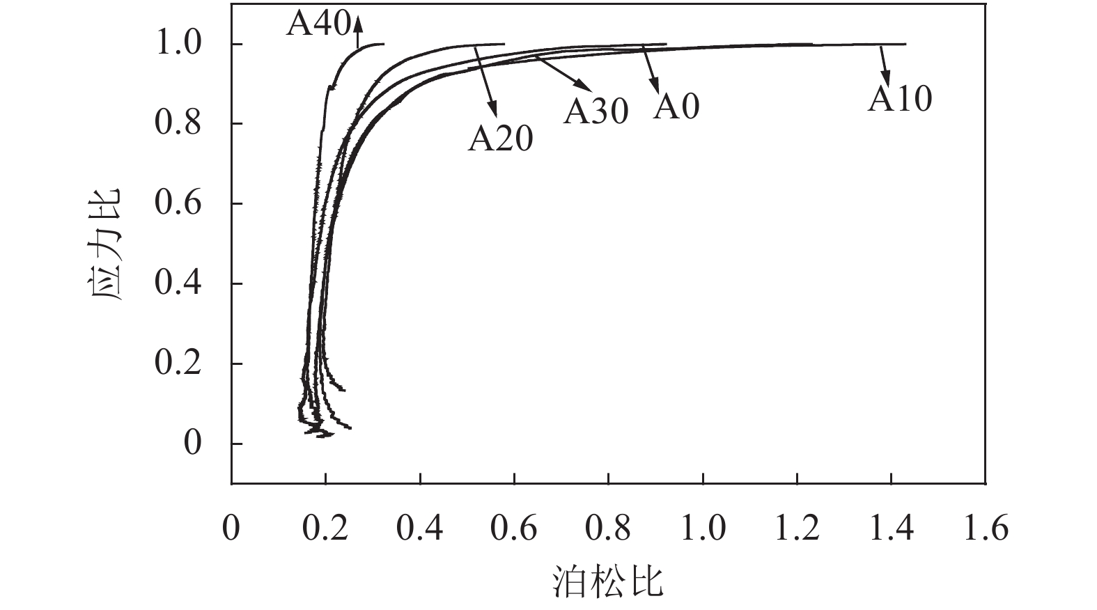 如图9、10所示:泊松比随着应力比增加而增加,应力比在0~0.65时,泊松比的变化幅度很小,说明混凝土试块纵向变形较大;随着荷载增大,应力比为0.65~0.80时,泊松比开始增加。当泊松比为0.5时,此时应力比达到0.8~0.9。主要原因是混凝土内部微裂缝开始较大发展,此后应力比增长放缓,而泊松比快速发展,混凝土横向应变增大,逐渐有可见裂缝出现在混凝土表面。