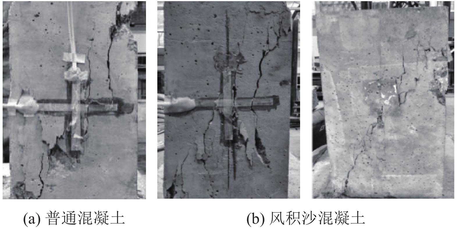 由图2可见,风积沙混凝土单轴受压破坏形貌与普通混凝土相似。当应力较小时,试件处于弹性阶段,并没有明显的微裂缝出现,在达到峰值应力前,由于微裂缝处应力集中使得试块表面中间出现少量短而细的竖向裂缝,与受力方向平行;随着荷载继续加大,应力超过峰值后,出现多条纵向不连续短裂缝,且应力下降较慢。接着在短时间内快速发展为贯通斜裂缝,并伴有劈裂声响,试件被压坏,属于典型的剪切滑移破坏。主斜裂缝与荷载垂线夹角为58°~64°。从破坏形态可以看出风积沙混凝土较普通混凝土裂缝细小且试块整体性较好。