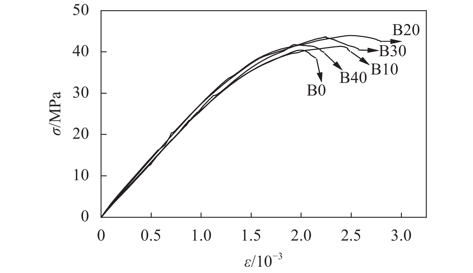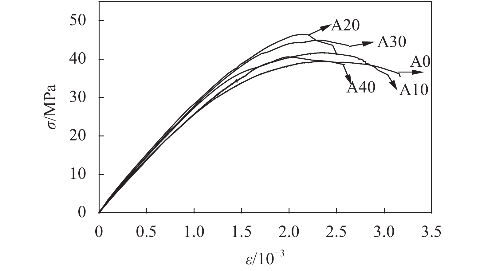 | 图4 粉煤灰掺量10%风积沙混凝土应力–应变曲线 Fig. 4 Stress–strain curves of aeolian sand concrete with fly ash content of 10% |
