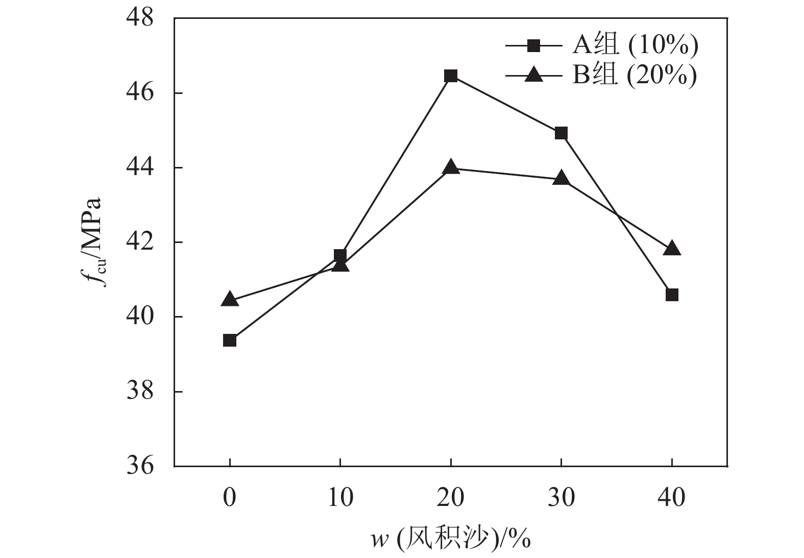 | 图6 风积沙掺量与轴心抗压强度关系 Fig. 6 Relationship between aeolian sand content and axial compressive strength |