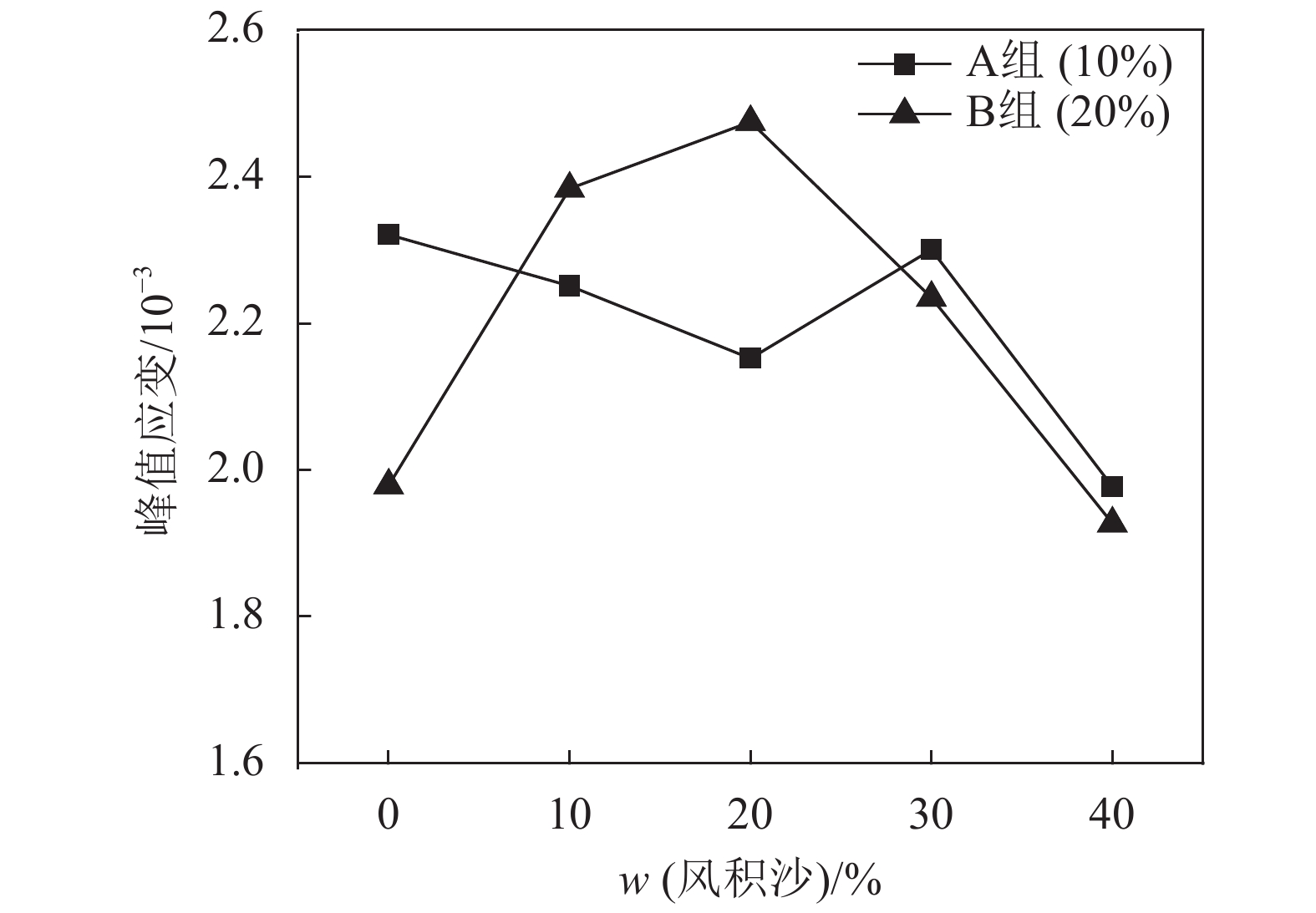 | 图7 风积沙掺量与峰值应变关系 Fig. 7 Relationship between aeolian sand content and peak strain |