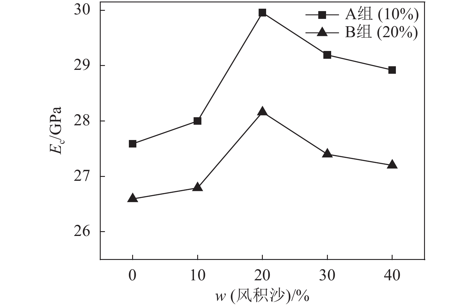 由图6可以看出,无论A组还是B组,随着风积沙掺量增加,混凝土轴心抗压强度先增加后减小,且均在风积沙掺量为20%时强度达到最大值。粉煤灰掺量相同时,A组各掺量风积沙混凝土轴心抗压强度较基准组由3.0%增至18.0%,B组增幅由2.3%至8.7%。由此可见,风积沙的掺入可以提高混凝土轴心抗压强度。风积沙含量相同,A组较B组轴心抗压强度分别提高–2.6%、0.7%、5.6%、2.8%、–2.9%。风积沙掺量10%、40%B组超过A组,且A组与B组之间的差距在缩小。主要是因为粉煤灰加入促进了混凝土后期强度的发展。