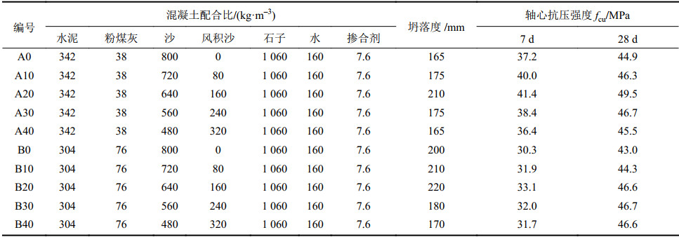 风积沙属于特细砂,比表面积大,配制混凝土时需要水泥量较多,需水量增多,拌合物比较黏稠、容易离析、泌水,造成混凝土配制比较困难[8]。试验采用粉煤灰与减水剂双掺技术来改善风积沙混凝土拌合物的和易性能。试验混凝土设计强度等级为C40,胶凝材料总量一定,内掺粉煤灰等质量替代水泥,替代率分别为10%和20%(粉煤灰替代率为30%时所测得的立方体抗压强度损失较大,实用意义较小,所以不进行30%替代率下混凝土轴心受压分析)。调整后混凝土的配合比如表2所示,表2中A、B分别表示粉煤灰掺量为10%、20%,其后面的数字表示风积沙掺量百分率。