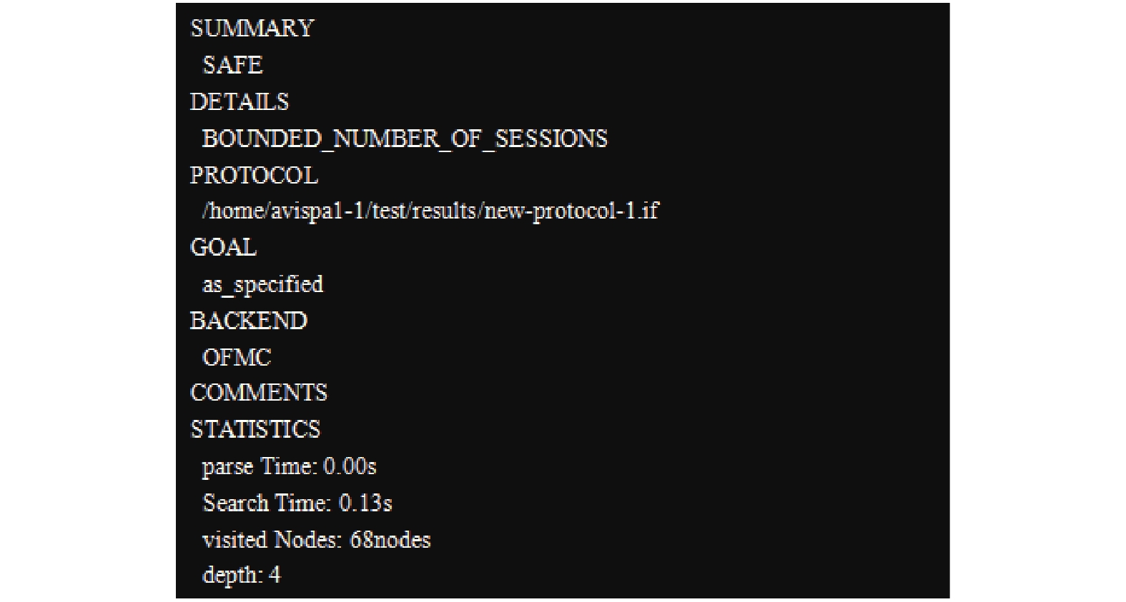 4.1.2 AVISPA仿真分析将AT–UAP转换为高级协议规范语言(high level protocols specification language,HLPSL)语言,利用Internet安全协议和应用程序自动验证(automated validation of internet security protocols and applications,AVISPA)的OFMC(on-the-fly-model-checker)分析终端模块[21-23],对本协议的安全性进行仿真验证,其结果如图6所示。