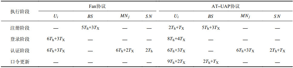 4.1.3 计算开销分析Fan协议和AT–UAP在注册、登录、认证和口令更新阶段的计算开销比较详见表2,其中,