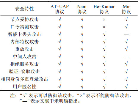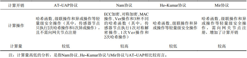 将AT–UAP与几种典型的平面无线传感网双因素UAP(Nam协议[16]、He–Kumar协议[17]与Mir协议[18])的性能(安全性与计算开销)进行对比分析,比较结果见表3、4所示。