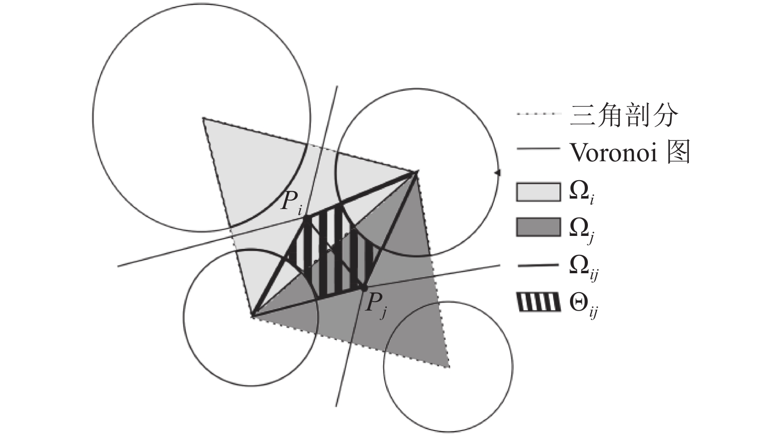 1.3 DEM–PFV耦合模拟方法DEM–PFV耦合方法[20-22]是处理流体与固体相互作用的一种耦合模型,如图1所示[22],在空间中,将离散元球体进行Delaunay三角剖分,形成由四面体网格构成的网络。Ωi为四面体网格i定义的域,其中包含了流体域Θi,相邻两个三角剖分产生的Voronoi单元交点Pi和Pj,以及固体颗粒所围成的域Θij,为两个孔隙网格交换流量的孔喉。
