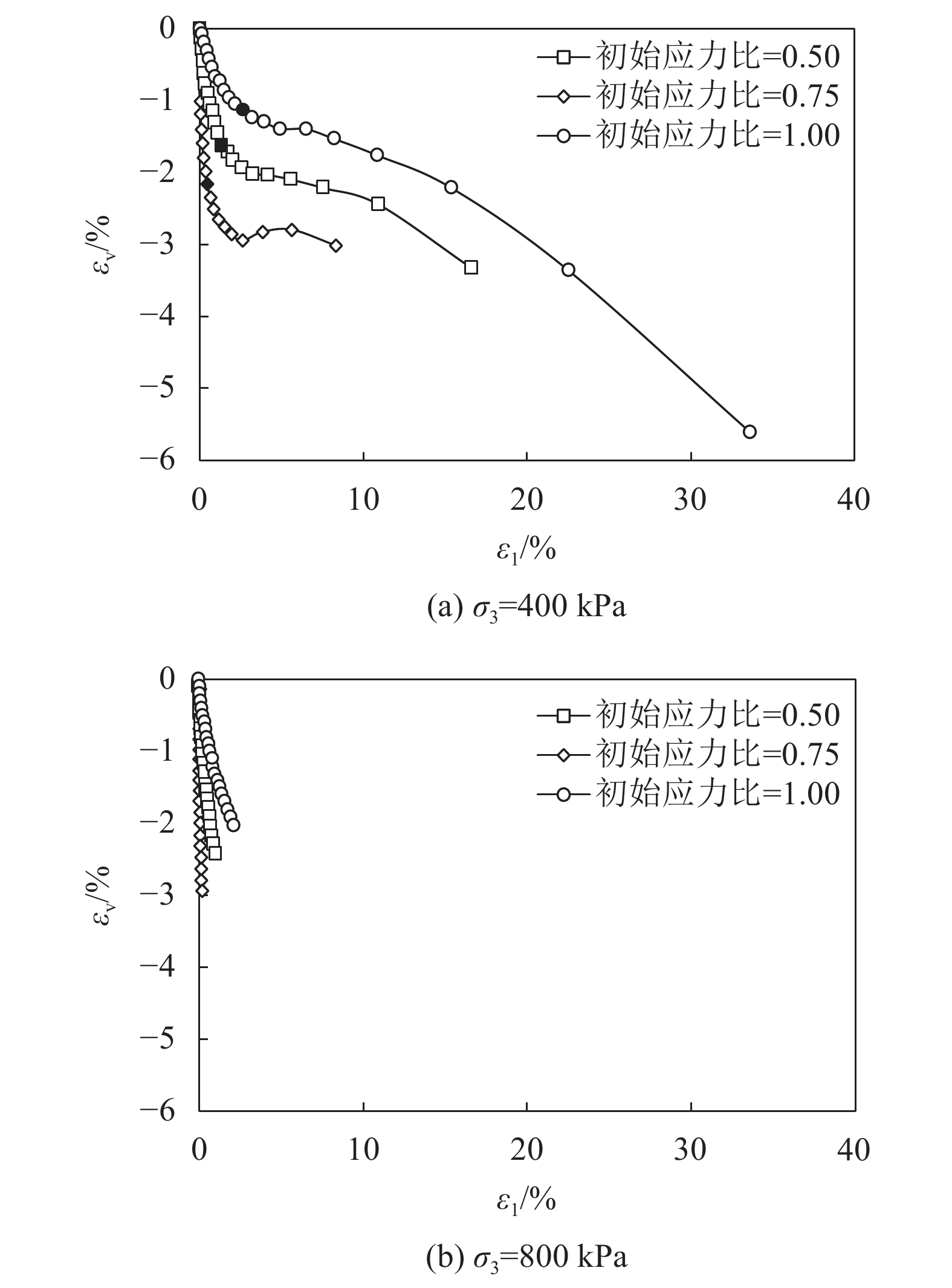 图6为400 kPa和800 kPa两种围压条件下,初始应力比分别为0.50、0.75和1.00时,轴应变