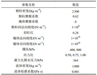相同级配条件下的直剪试验测得内摩擦角为31.7°。无黏性土的颗粒摩擦系数与材料摩擦系数接近,因此在模拟中依据直剪试验结果将颗粒摩擦系数设为0.62。泊松比参考既有地质资料和模拟试验结果[28]定为0.28。立方体模型受到3对无摩擦刚性墙的限制,若墙体刚度较低,与墙相邻的颗粒容易逸出[29],墙体的刚度通常比颗粒的刚度大几个数量级[30-32]。因此,确定墙体法向刚度为颗粒法向刚度的100倍。