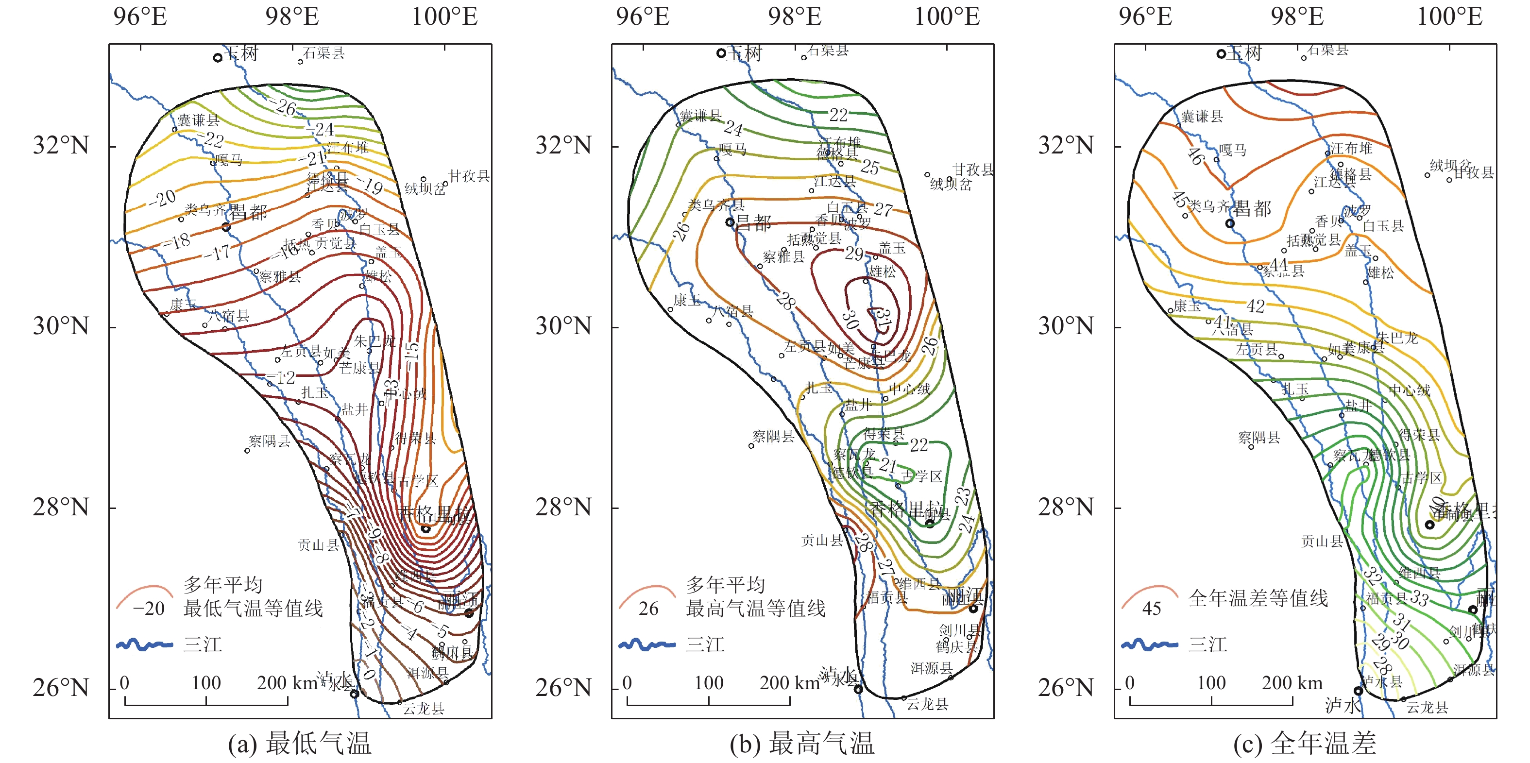 | 图10 研究区多年最低、最高、温差等值线 Fig. 10 Lowest, highest and temperature difference isoline in the study area for many years |