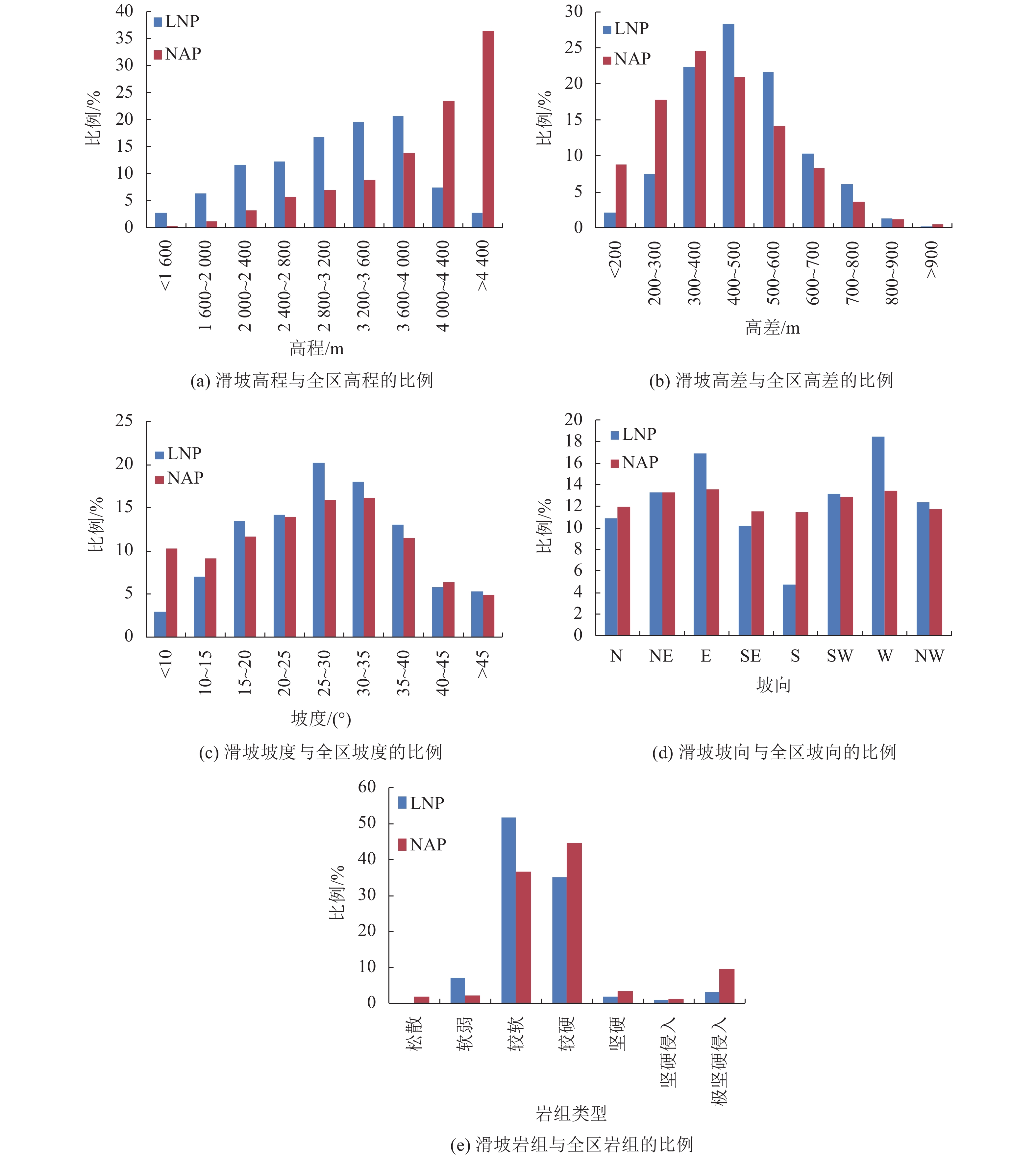 1)滑坡主要发育在2000~4000 m的海拔区,LNP为80.84%,NAP为38.56%。按400 m高程分段,1600~4000 m 段,LNP逐渐升高(图5、6(a))。