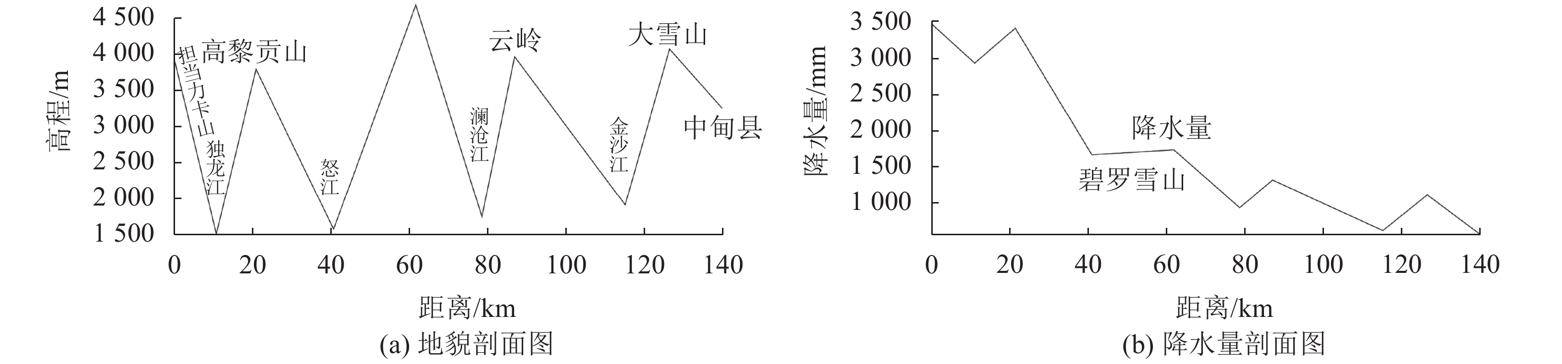 | 图9 南三江地区降水量与地貌关系对应剖面图[19] Fig. 9 Profile of the relationship between precipitation and geomorphology in the south of three-river region[19] |