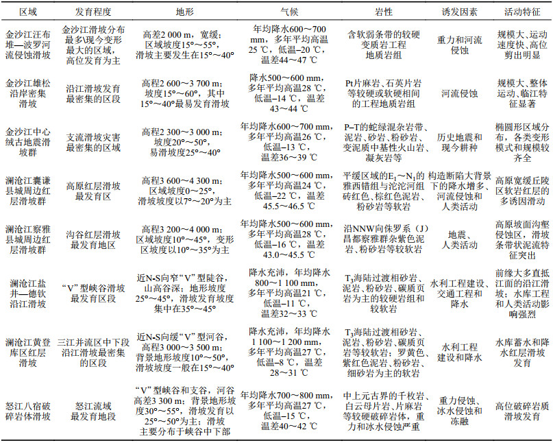 5 主要发育区三江并流区的活动性滑坡主要沿河谷分布,但在不同的区段有较大的差别,主要集中在8个地区。