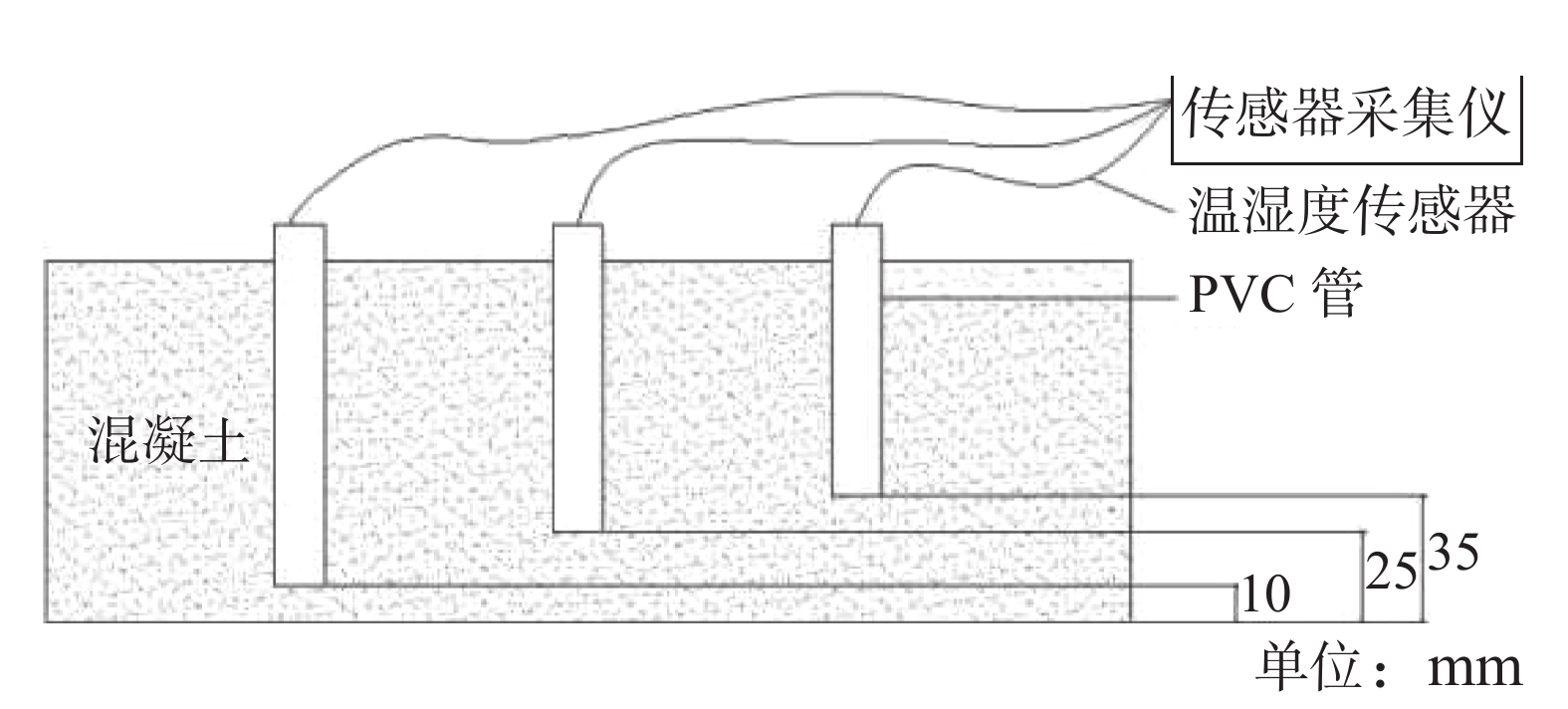 浇筑长×宽×高为300 mm×100 mm×100 mm的混凝土试块,成型过程中将外径16 mm、内径14 mm的PVC管等间距插入混凝土内部,PVC管底端2 mm高度以下切割成锯齿状,PVC管埋置深度分别为距底面10、25、35 mm。为防止PVC管上浮,使用废弃的混凝土试块压住PVC管卡板。试块在标准养护室(温度(20±2)℃,95% RH)养护28 d后,将温湿度传感器放入PVC管内,使传感器探头顶端尽量靠近PVC管底端,使用环氧树脂对传感器进行封装,如图1所示。在室内继续放置2个月后,开始后续试验。