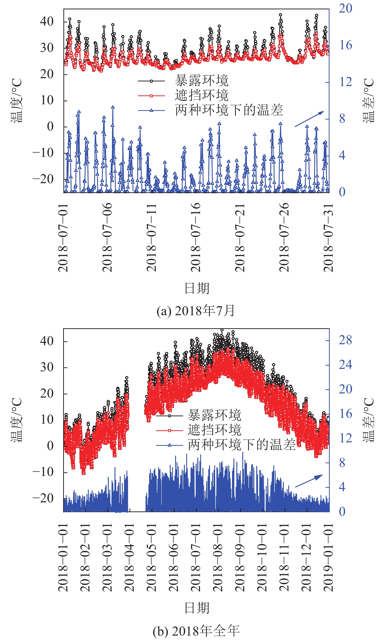 2018年1月1日至2018年12月31日,青岛地区一般大气环境温度实测数据如图2(b)所示(图2(b)中数据中断部分是由数据采集过程中断电所致)。由图2(b)可知,由于地球公转时间和速率相对固定,遮挡环境和暴露环境中全年大气温度均呈现明显的周期性变化。两种环境下大气最低温度均约为–10 ℃左右;最高温度差异明显,遮挡环境下全年最高大气温约为36 ℃,暴露环境下全年最高大气温约为45 ℃,相差约9 ℃。暴露环境和遮挡环境间温差年变化规律与大气年温度变化规律基本一致,环境温度高时,温差大,反之温差小。夏季温差为7 ℃左右,冬季温差为2 ℃左右,主要由太阳辐射强度变化引起。