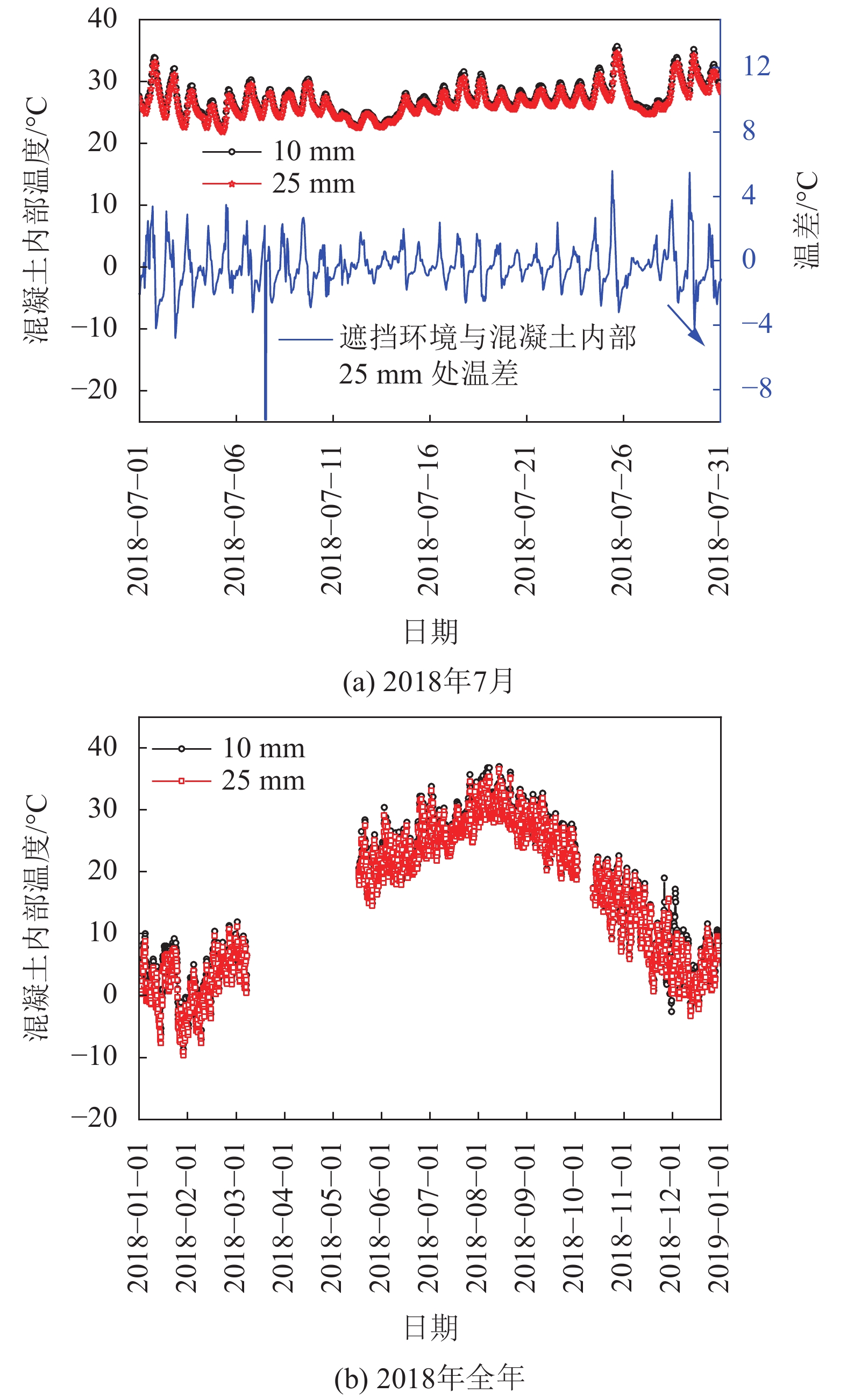 2.2 混凝土内部温度响应规律青岛市7月份一般大气遮挡环境下混凝土内部10和25 mm深度处的温度响应如图3(a)所示。很明显,两个深度处温度响应规律一致,与大气温度作用一样呈现周期性波动规律。25 mm深度处温度的响应比10 mm深度处相位略滞后,幅值略有衰减。这是因为热量的传递需要时间,所以深度越深对外界温度作用的响应敏感度越低。此外,混凝土内外温差的周期性波动规律类似于温度变化规律,波动周期相同,但波峰和波谷出现时间不同。两个深度处混凝土温度最高时,温差最小;混凝土温度最低时,温差最大。这是因为混凝土内外温差大时热量传递快,温差小时热量传递慢。图3(b)为2018年全年遮挡环境下混凝土内部10和25 mm深度处的温度响应情况。由图3(b)可知,全年温度响应规律亦呈现出和大气温度作用相似的周期性变化规律。