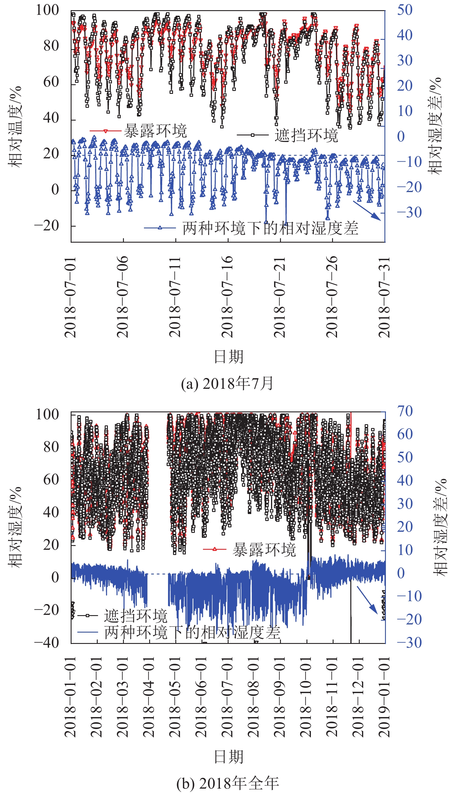 青岛市7月份遮挡/暴露环境相对湿度实测数据如图5(a)所示。由图5(a)可知,自然环境相对湿度变化规律类似于温度变化规律,也是呈现出以24 h为周期的波动性变化规律。与图2结果对比可以看出,相对湿度峰值与温度峰值出现的时间相反。即:午后温度最高时,相对湿度值最小;凌晨温度最低时,相对湿度值最大。两环境相对湿度差值亦表现出和环境相对湿度一样的变化规律,暴露环境的相对湿度变化幅值大于遮挡环境。这是因为相对湿度是温度的函数,暴露环境下混凝土内部的最高温高于遮挡环境,致使其相对湿度较低;而暴露环境下混凝土内部最低温度低于遮挡环境,使其相对湿度较高。图5(b)为2018年全年的大气相对湿度实测数据。由图5(b)可见,遮挡/暴露环境下大气相对湿度以1年为周期呈现季节性变化,夏季相对湿度大,冬季相对湿度小,但是相对于温度变化,相对湿度变化波动范围更大。暴露环境与遮挡环境的相对湿度差也呈现出了年变化规律,春季和冬季相对湿度差较小,而夏季和秋季相对湿度差较大。