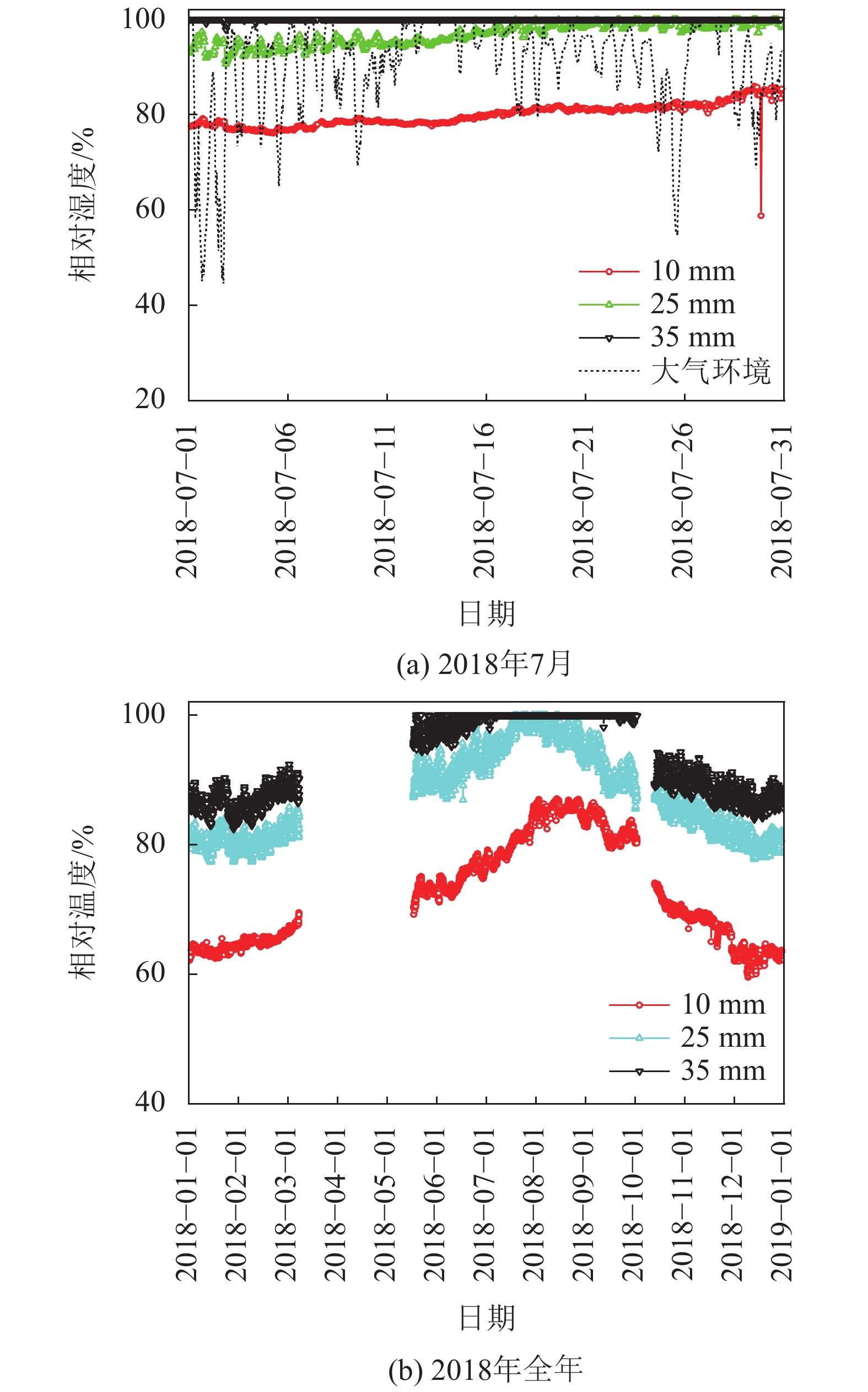 | 图6 遮挡环境下混凝土内部湿度响应 Fig. 6 Response of relative humidity of concrete at sheltered environment |