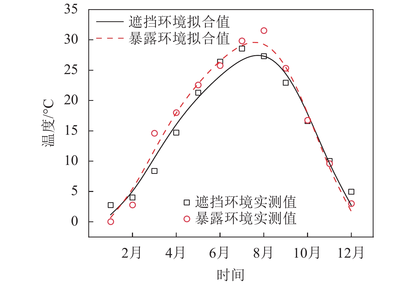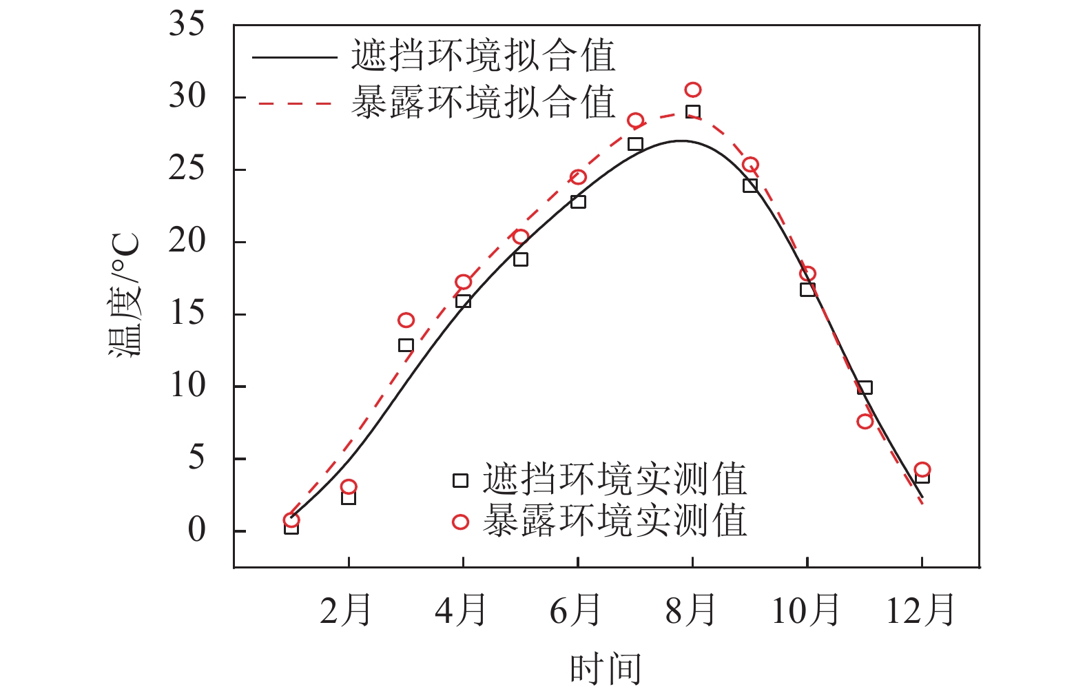 2 大气环境温度变化规律及混凝土内部温度响应 2.1 大气环境温度变化规律青岛市2018年7月份一般大气环境温度实测数据如图2(a)所示。由图2(a)可知,大气环境温度呈现周期性波动规律,变化周期为24 h。1:00至6:00温度逐渐降低至最低值;7:00至14:00温度逐渐升高,最高温出现在14:00左右;随即温度逐渐降低。温度变化曲线可分为3段,降温段1(1:00—6:00)、升温段(7:00—14:00)、降温段2(14:00—24:00)。遮挡环境与暴露环境下温度变化规律基本一致,两环境间温差随环境温度的升降而升降。受太阳辐射的影响,暴露环境的温度升高速度更快,温度最高值明显大于遮挡环境下温度最高值。随着太阳辐射强度的变化,暴露环境与遮挡环境的温差也呈现出规律性变化。14时温差达最大值,随后温差逐渐降低,当气温达最低时,温差趋于0。3个时间段的温度变化均可采用余弦函数表达[17],如式(1)所示。