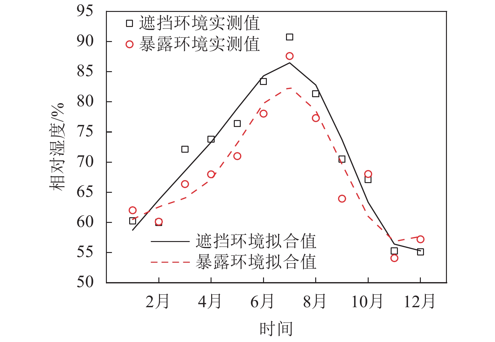3)大气环境日相对湿度变化规律与日温度变化规律相似,但温度达最大时,相对湿度最小。暴露环境的相对湿度变化幅值大于遮挡环境的相对湿度变化幅值。年大气相对湿度以1年为周期呈现明显的周期性变化,夏季相对湿度大,冬季相对湿度小。