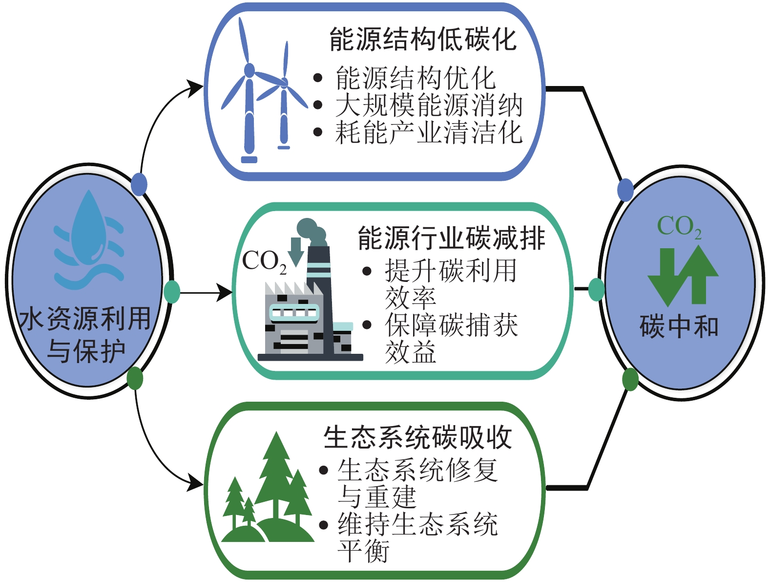 事实上,地球环境系统受控于多个重要的循环过程,其中以碳循环与水循环尤为重要,且两者不可避免地交叠并相互影响,相辅相成又相互制约[4-6]。实现碳中和,其实质上是实现人类活动的二氧化碳排放量“收支相抵”,而实现零排放碳循环过程则需要高效水循环过程的辅助和支撑。众所周知,水是生命之源、生态之基、生产之要[7]。实现水资源有效保护与利用,事关国家安全和民族振兴,是国家推进能源结构调整,促进低碳技术发展和环境保护,应对全球气候变化,实现“碳达峰、碳中和”战略目标的关键基础。然而,如何通过实现水资源安全高效利用与保护,助力碳中和战略实施,成为未来较长时期人类必须面对和解决的核心科技难题。