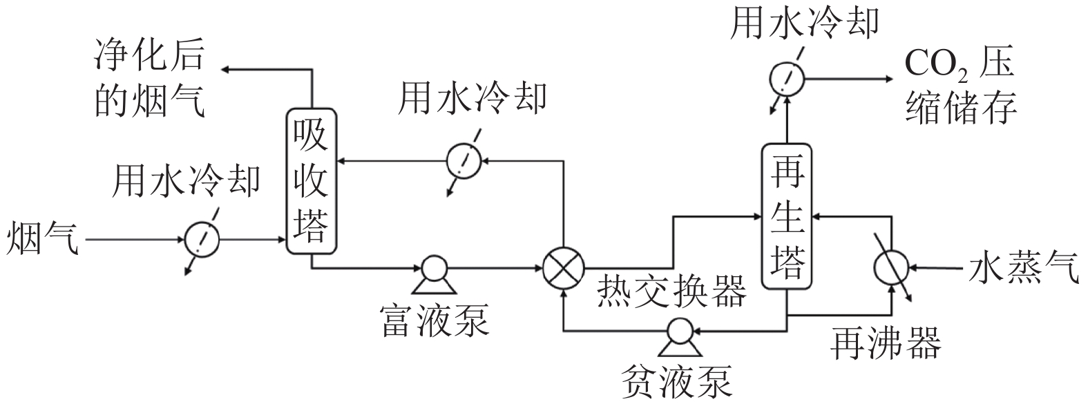 通常来说,化学吸收法捕集CO2的解吸过程一般利用热法再生,该技术的工艺流程[48]如图3所示。脱硫脱硝后的烟气首先通过直接接触式冷却器进行冷却,贫胺基溶剂在吸收塔中从烟气中吸收CO2,再用水去除任何残留的氨;然后,将富含CO2的溶剂泵送到再生塔,通过加热分离CO2,浓缩的CO2被压缩并运输到储存地点。在此过程中,需要水来支持直接接触式冷却器、吸收塔和再生塔的冷却环节,同时需要水蒸气为再生塔中分离CO2提供热量。上述技术需要的额外消耗性用水量将比普通火力发电厂提升83%~91%[49]。