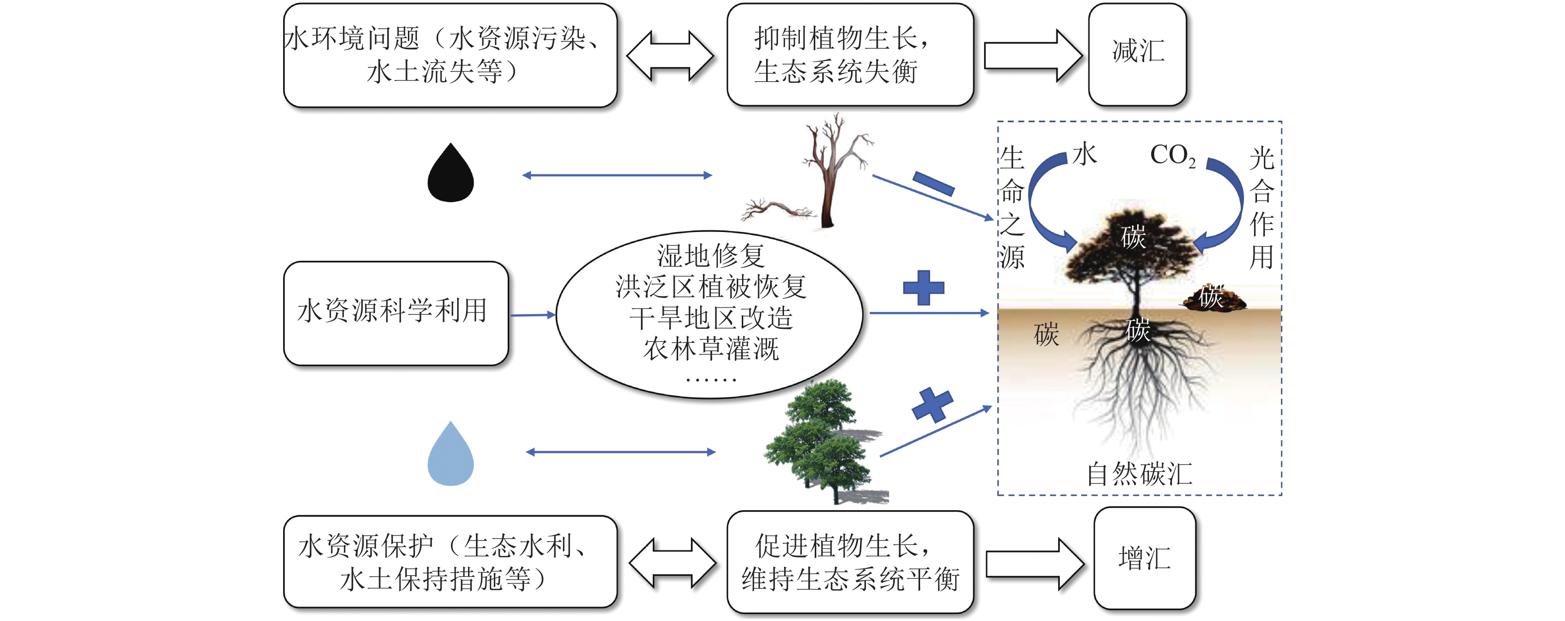自然碳汇是应对“碳达峰、碳中和”最经济的方式之一,中国陆地生态系统中,森林生态系统贡献了约80%的固碳量,农田生态系统对固碳量的贡献约占12%,灌丛生态系统的贡献度约为8%,草地生态系统的碳收支基本处于平衡状态[52]。碳汇功能主要通过森林、草地、湿地等生态系统中的植物进行光合作用将CO2转换为有机碳固定在植被或土壤中而实现[53]。而水作为重要的生态因子,影响着植物的生命活动及土壤状态,从而影响生态系统固碳能力[54-55],水资源利用与保护与自然碳汇增减关系[56]如图4所示。