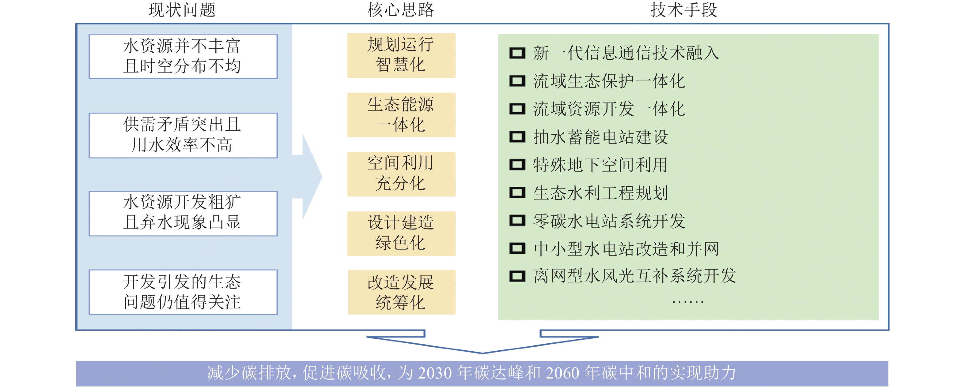 摘要: 实现水资源高效智慧的利用与保护,是国家推进能源结构调整,促进低碳技术发展和环境保护,应对全球气候变化,实现“碳达峰、碳中和”战略目标的共性关键基础。为此,本文从水资源科技发展对碳中和的重大促进作用视角出发,回顾总结了水资源利用与保护的历史和战略发展趋势,阐明了水资源利用对开拓清洁能源应用潜力、促进国家能源结构低碳化的关键作用,研究了水资源利用与保护对于缩减碳源、提高碳汇的天然优势,并从规划运行智慧化、生态能源一体化、空间利用充分化、设计建造绿色化和改造发展统筹化等五大发展方向,系统凝练了智慧水利信息网络及反馈调控、多源信息监测体系及一体化模式、特殊地下空间利用及地下蓄能设施、生态水利工程及零碳水电站系统、中小型水电站改造并网及离网型水风光互补系统等高效智慧利用与保护水资源的技术方法。研究成果对长江黄河等重要流域保护、推进国家水资源利用重大战略工程实践、助力实现碳达峰、碳中和“3060”目标均具有重要促进意义。Abstract: The effective protection and utilization of water resources is the common key basis for the country to promote the adjustment of energy structure, to develop low-carbon technology and environmental protection, to cope with global climate change, and to achieve the strategic goal of “reaching carbon peak in 2030 and reaching carbon neutralization in 2060”. From the perspective of the significant role of water resources science and technology development in promoting carbon neutralization, the history and strategic development trend of water resources utilization and protection was reviewed and summarized, and the key role of water resources utilization in developing the application potential of clean energy and promoting the low carbon of national energy structure was elaborated. The natural advantages of water resources utilization and protection in reducing carbon sources and improving carbon sinks were studied. The technical methods of efficient and intelligent utilization and protection of water resources were systematically reviewed, such as intelligent water conservancy information network and feedback regulation, multi-source information monitoring system and integrated model, special underground space utilization and underground energy storage facilities, eco-hydraulic engineering and zero-carbon hydropower station system, transformation and grid connection of small-medium hydropower stations, and off-grid wind–light–water complementary system, based on the five development directions of intelligent planning and operation, ecological energy integration, full differentiation of space utilization, green design and construction and overall planning of transformation and development. The research findings are of great significance to protect the Yangtze River, Yellow River, and other important river basins, to promote the practice of national water resources utilization major strategic projects, and to help to achieve the “3060 Goal”.
