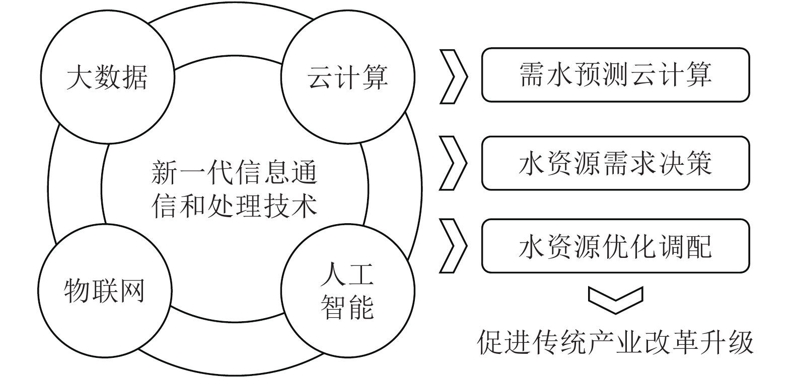 碳中和背景下,水资源利用与保护的规划运行智慧化,如图6所示,其发展方向主要包括:1)新一代信息通信和处理技术应用。信息是水资源智慧化的关键,引入大数据、物联网、云计算、人工智能等技术,做到水资源实时监测与动态预测相配合,进而实现对水资源的智能识别、跟踪定位、模拟预测、优化分配和监控管理,间接促进传统产业改革升级。 2)水资源需求决策和优化调配。结合径流监测预报、生态环境承载力与给水需求,联动地表水、地下水、再生水等多方水源形式,设计科学的水资源分配模式,实现高效水资源利用,保障流域生态需水和健康发展用水。3)需水预测云计算。通过大数据、云计算等技术对大量广泛的水信息数据进行处理,形成径流流量和需水预报多目标参量模型,预测可能需水量和水资源供需关系,动态实时分配水资源[72]。