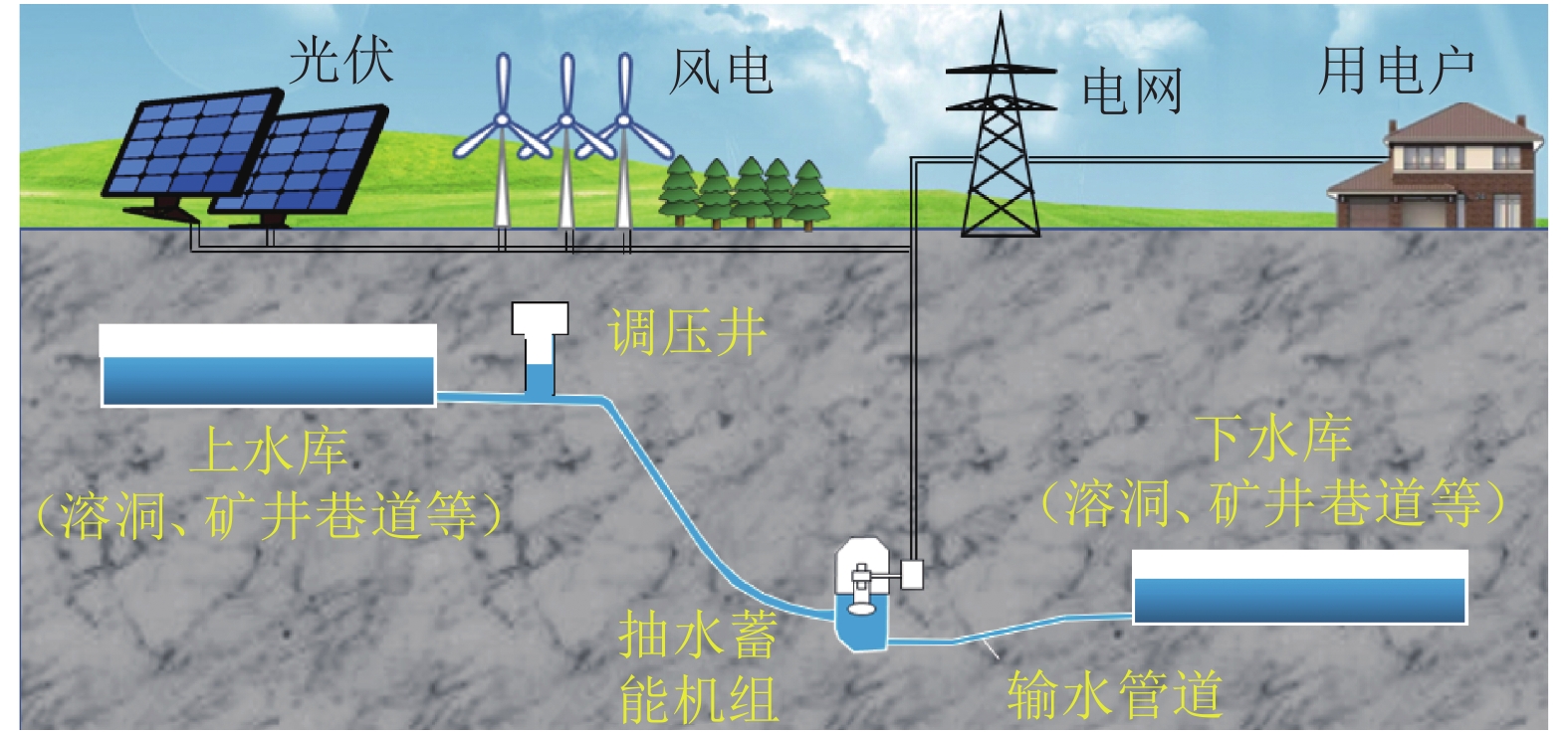 伴随着中国能源结构的持续调整,风电、光伏等清洁能源所占比例将逐年递增,但目前这类新能源调节能力较弱且并网后有较强的波动性,导致弃风、弃光现象凸显。为此,充分利用水利资源灵活的调节能力建立抽水蓄能电站,可有效降低电网中的弃风弃光率,合理优化现有能源结构,建立水风光储一体化的能源波动系统,大力推进碳减排。但常规的抽水蓄能电站需要耗费大量有限地表资源,且易受地形、地貌和水文条件等影响,近年来,国内外学者提出了基于抽水蓄能原理的落差型地下蓄能设施[73,81],其技术原理相对成熟,能量转化率可达80%左右,可充分利用特殊地下空间,减小对地表资源的占用和改造,未来发展前景巨大。