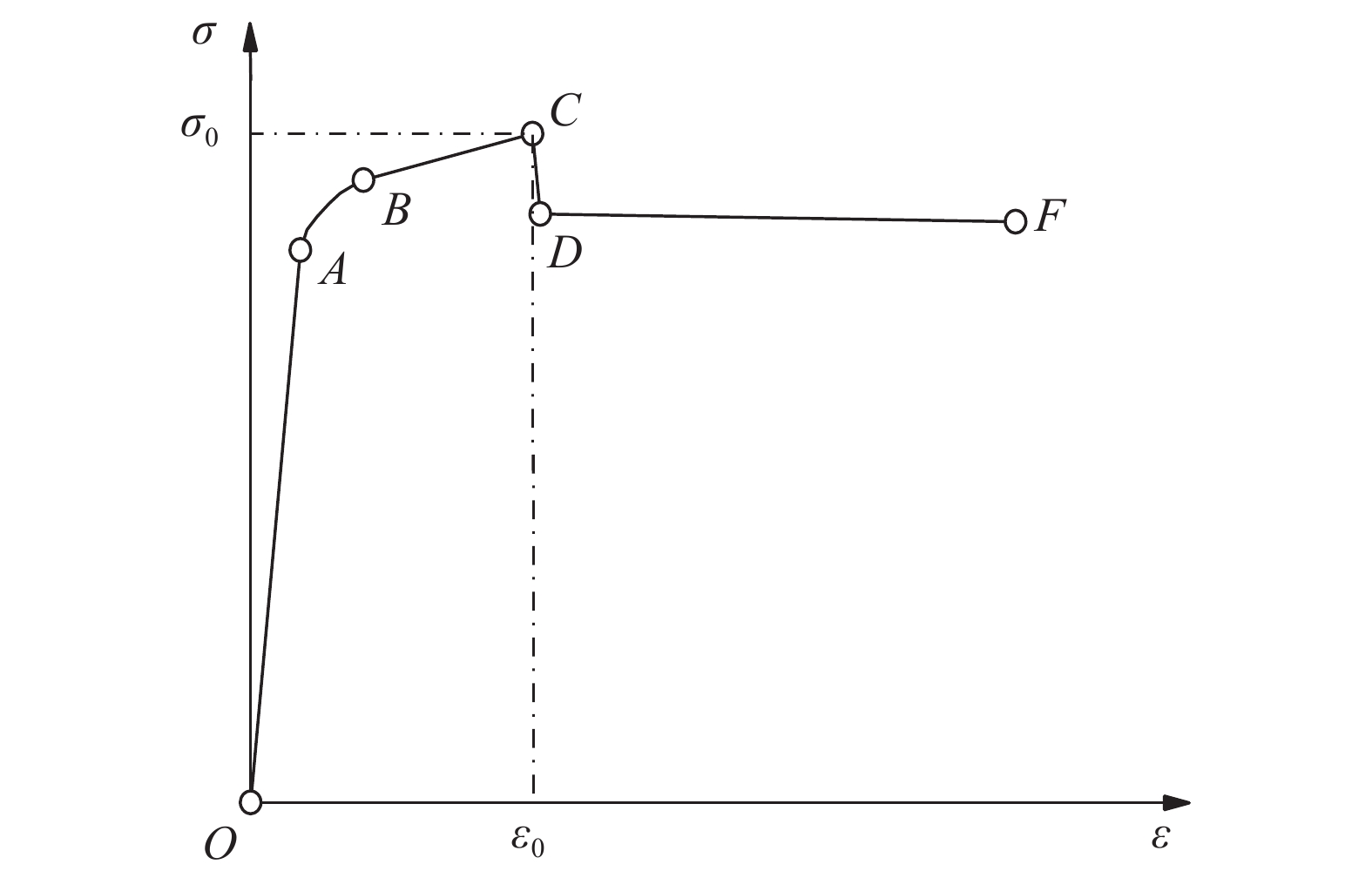 图1为典型的CFRP约束钢管高强混凝土短柱的应力–应变曲线,结合文献[15-16, 22-24]中的试件受力破坏过程可知,CFRP约束高强HSC试件破坏过程与CFRP约束钢管混凝土相似,不同之处主要体现在核心HSC的高强与脆性特性,从而造成了工作机制的差异。因此,从HSC、钢管与CFRP3类材料在组合构件中的受力特点进行工作机制分析如下: