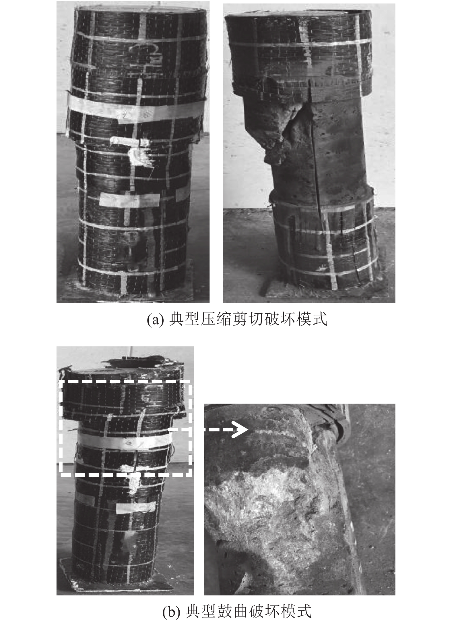 图2为典型的CFRP约束钢管HSC破坏模式[22]。实质上,CFRP约束钢管HSC短柱可以看作是CFRP约束钢管混凝土中的普通混凝土被高强的HSC替代所形成的组合构件。与CFRP约束钢管混凝土[23-24]相比,CFRP约束钢管HSC短柱[15-16,22]的受力破坏不同之处,主要是基于核心HSC的特性所致: