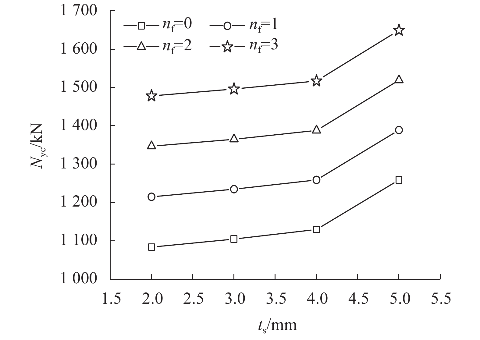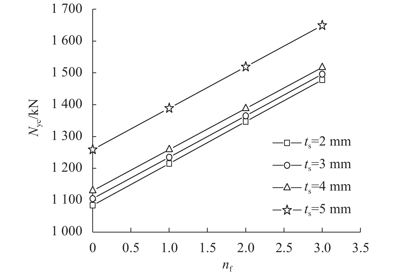 理论模型承载力计算值。图5和6分别为本文理论模型极限承载力计算值Nyc随CFRP层数nf和钢管壁厚ts的变化。由图5、6分析可知:CFRP层数对于极限承载力的提高幅度较为明显;钢管壁厚对于极限承载力的提高幅度在ts = 2~4 mm时趋于平缓,而在ts = 5 mm时有较大的提高,这表明对于高强的HSC,钢管壁厚较大时约束效果比较明显。