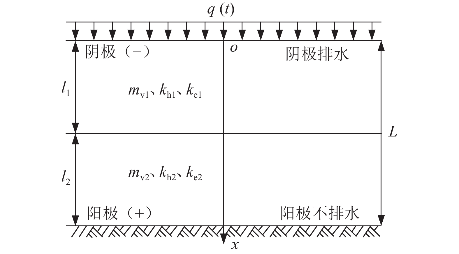 双层地基是天然层状地基中最简单的形式。Gray[12]最先对瞬时加载下双层地基固结问题进行了研究。Schiffman和Stein[13]在Gray[12]工作的基础上,针对一系列边界条件和复杂应力历史,给出了成层地基固结问题的解答。栾茂田等[14]利用分离变量法得到了外载沿深度分段线性分布的双层地基1维固结解析解。Lee等[15]得到了瞬时荷载下成层地基1维固结解析解。随后,有学者研究了变荷载对层状地基固结的影响:谢康和等[16-17]给出了单级加载下双层及成层地基1维固结问题完整的解析解答;杨峻等[18]求解了循环荷载作用下双层地基的1维固结。此后,一些学者进一步考虑非线性[19-20]、非达西[21-22]及大变形[23]等因素,研究了双层地基1维固结特性。但需注意的是,目前对层状地基电渗固结理论的相关研究仍较少,虽然Zhao等[24]在Esrig[11]的基础上推导出双层地基1维电渗固结解析解,但仍然没有考虑堆载–电渗的联合作用效果以及按沉降定义的平均固结度与按孔压定义的平均固结度的区别。