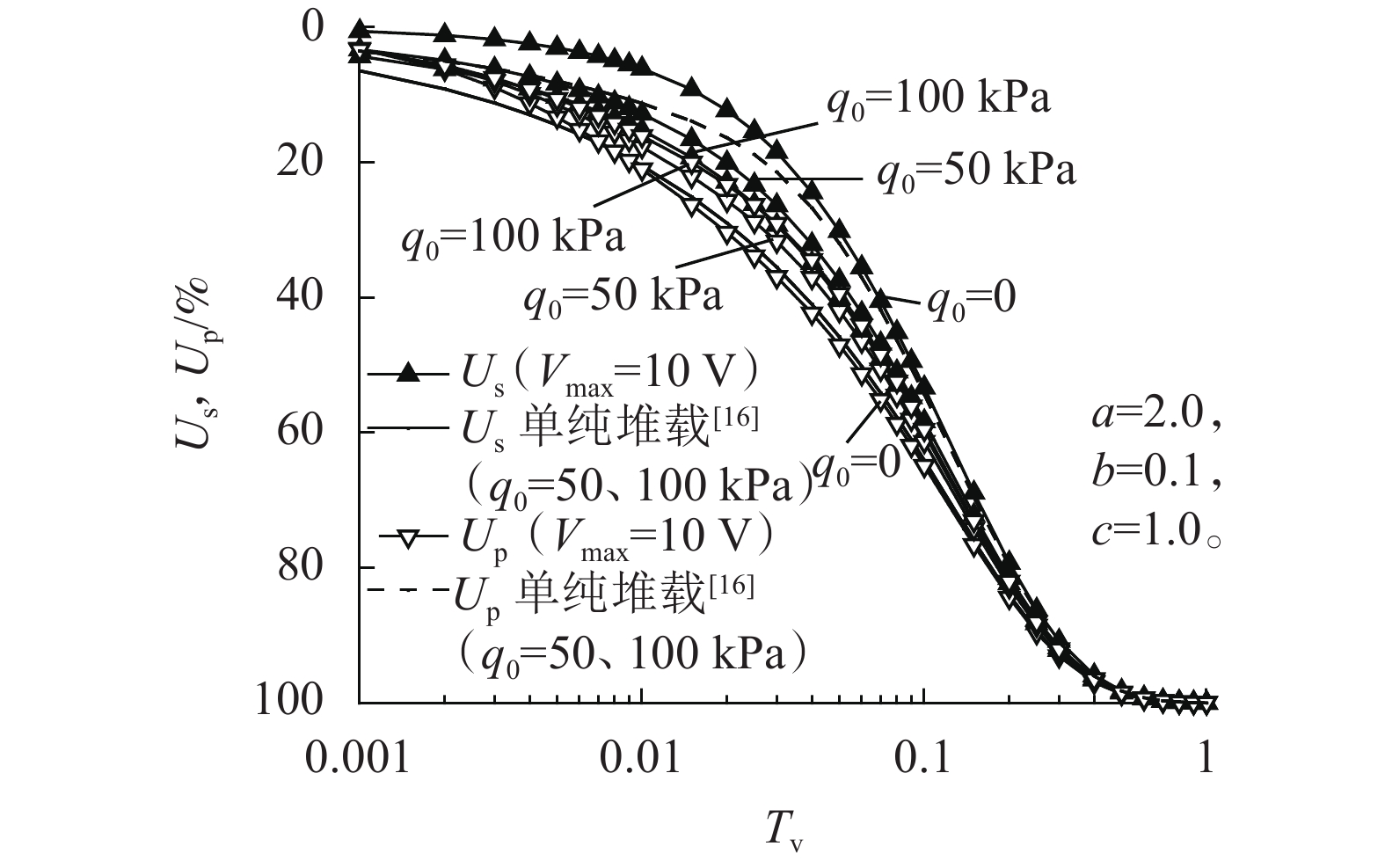 图10描述了固定电源电压Vmax=10 V,瞬时堆载条件下,瞬时堆载q0值对按沉降定义的平均固结度Us和按孔压定义的平均固结度Up的影响。