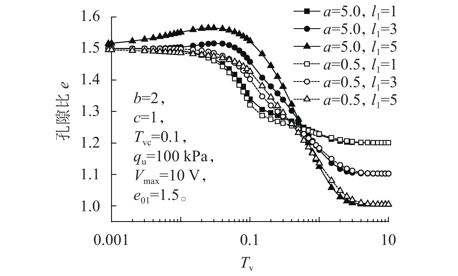 $$ {e_i} = {e_{0i}} - {m_{{\text{v}}i}}(1 + {e_{0i}}){\sigma '_i} $$ (54) 图11为固定荷载参数Tvc=0.1,qu=100 kPa,电源电压Vmax=10 V,上层土的初始孔隙比e01=1.5时,变荷载作用下固结过程中孔隙比随时间的变化曲线。当a=5.0时,靠近土层中部的孔隙比呈先增大后减小的趋势,表明在固结初期土体表现为膨胀,之后转为压缩。当a=0.5时,不同深度土体均随时间的增大而逐渐压缩。再次说明了只有a>1.0时,土体中部才会在固结初期出现膨胀的现象,这与图5和6的结论可以相互验证。