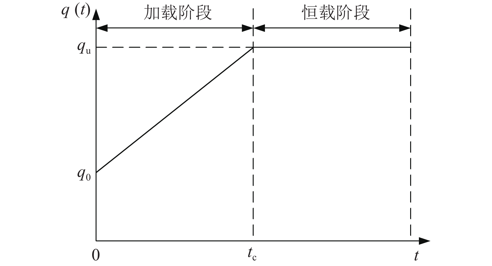 $$ q(t) = \left\{ \begin{gathered} {q_0} + \frac{{{q_{\text{u}}} - {q_0}}}{{{t_{\text{c}}}}}t,{\text{ 0}} \le t \lt {t_{\text{c}}}; \hfill \\ {q_{\text{u}}}{\text{, }}{t_{\text{c}}} \le t \hfill \\ \end{gathered} \right. $$ (1) 式中,q0和qu分别为初始荷载和恒载阶段荷载,t为时间,tc为加载完成时间。