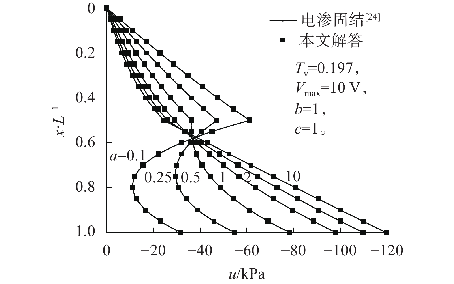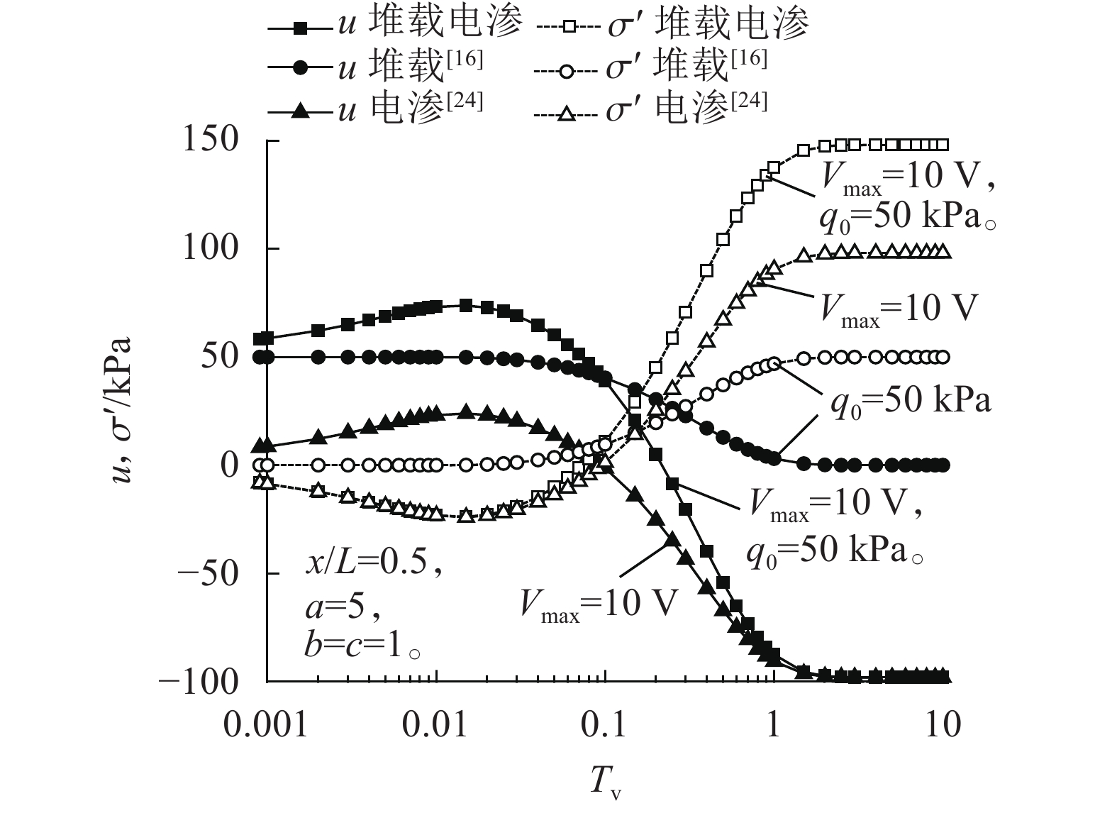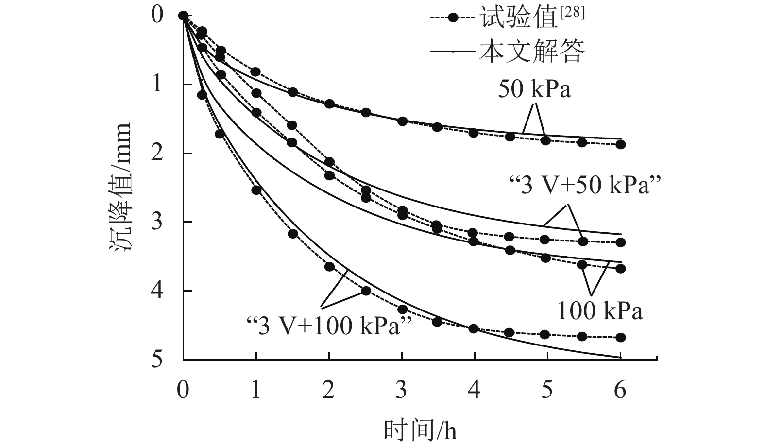由于表2中,堆载–电渗联合作用固结试验给定的土体基本物理参数[28]没有体积压缩系数mv、水力渗透系数kh和电渗渗透系数ke,而这3个参数是本文解答必不可少的,因此需要先反演出这3个参数。根据单纯50 kPa荷载作用下的固结试验的最终沉降值,可以反演出体积压缩系数mv为1.249×10–3,由50 kPa荷载作用下的固结试验的沉降曲线可以反演出水力渗透系数kh为6×10–10。进一步,由“3 V+50 kPa”的荷载–电渗联合作用下的固结试验的最终沉降值反演出电渗渗透系数ke为1.6×10–9。通过本文解答与100 kPa荷载作用下和“3 V+100 kPa”荷载–电渗联合作用下的固结试验对比可知,解析解与试验曲线有一定差距,但总体上较为吻合,进一步验证了本文解答的合理性。此外,由图4可以看出,考虑堆载–电渗联合作用的土体沉降值最大,说明电渗联合堆载作用能有效提高地基强度。增加电渗的环节,可以进一步增强堆载作用的影响,其作用效果类似于超载预压,更有利于减小工后沉降并且加快堆载作用下的地基处理速率。