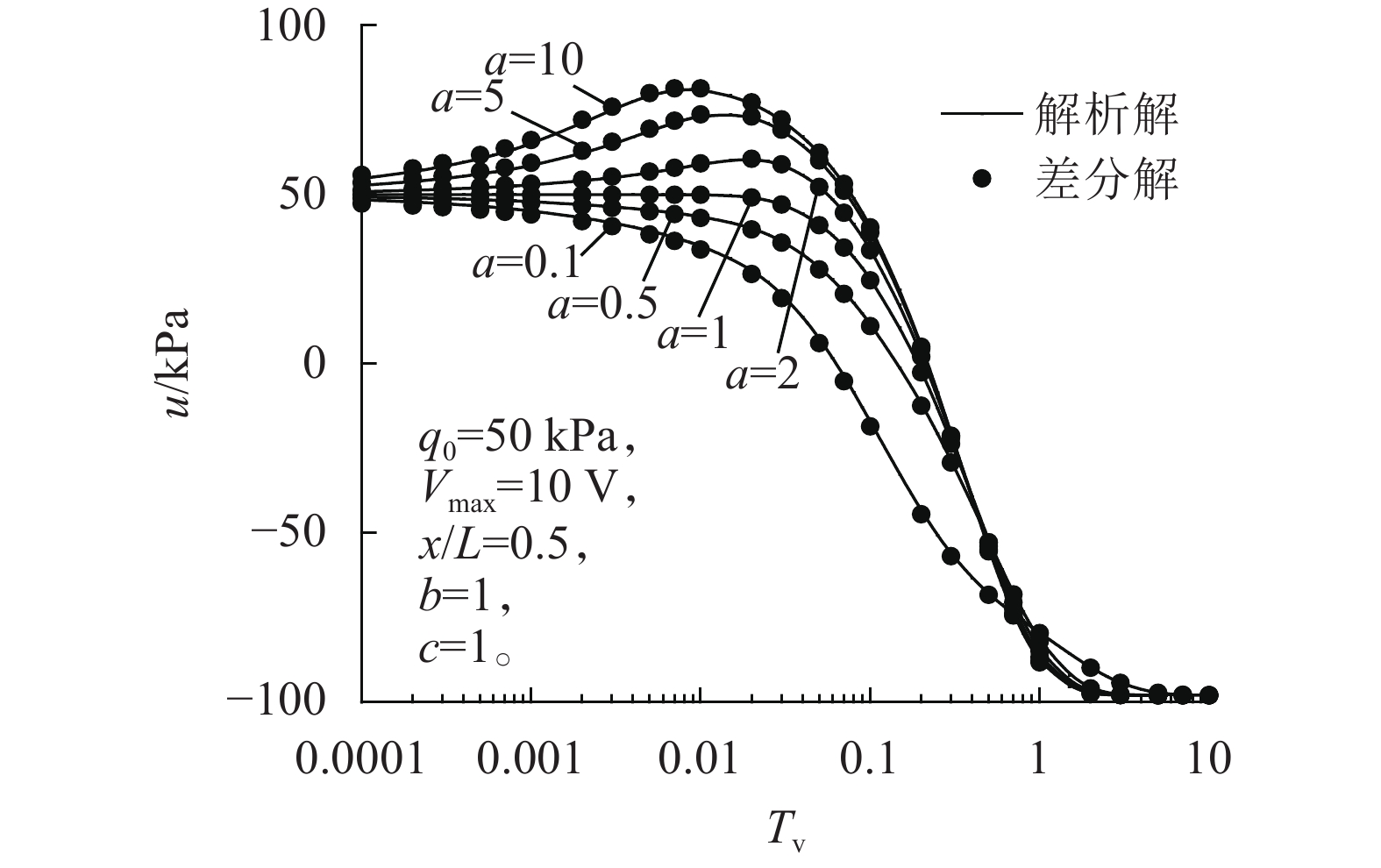 $$ \begin{aligned}[b] {B_m} =& \frac{{2a{k_{{\text{e}}i}}{\gamma _{\text{w}}}{V_{\max }}\sin \;{\lambda _m}\cos (\mu c{\lambda _m})}}{{{k_{{\text{h}}i}}(1 + c)\lambda _m^2[{{\cos }^2}(\mu c{\lambda _m}) + bc{{\sin }^2}\;{\lambda _m}]}}+ \\ & \frac{{2{k_{{\text{e}}i}}{\gamma _{\text{w}}}{V_{\max }}\sin \;{\lambda _m}\cos (\mu c{\lambda _m})(1 - a)\cos (\mu c{\lambda _m})}}{{{k_{{\text{h}}i}}(1 + c)\lambda _m^2[{{\cos }^2}(\mu c{\lambda _m}) + bc{{\sin }^2}\;{\lambda _m}]}}+ \\ & \frac{{2{q_0}}}{{{\lambda _m}(1 + bcA_m^2)}}\\[-10pt] \end{aligned} $$ (40) 1)瞬时堆载情况