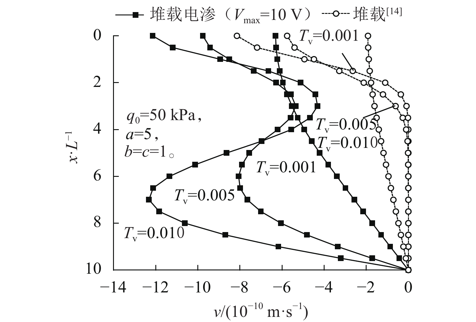 为进一步说明该现象,图6描述了不同时间因数下,堆载–电渗联合作用和单纯堆载作用的渗透流速沿土层深度分布情况。图6中,渗透流速为负值表示渗透流速方向竖直向上。单纯堆载作用下,在固结初期土体内部超静孔隙水值等于外荷载值,土体内部孔隙水来不及消散,从而在图6中表现为土体内部渗透流速几乎为0;随着时间因数的增大,土体内部孔隙水逐渐消散,渗透流速逐渐增大。而堆载–电渗联合下,在土层分界面附近区域,土层下方的渗透流速大于土层上方的渗透流速,说明图5中土层分界面处超静孔隙水压力在固结初期上升是由土层下方流入的水量大于流出的水量引起的。随着时间因数的增大,电渗作用下土体内部渗透流速的差异逐渐减小,最终上层土的渗透流速更大,表现为时间因数较大时土体内部的超静孔隙水压力逐渐消散。