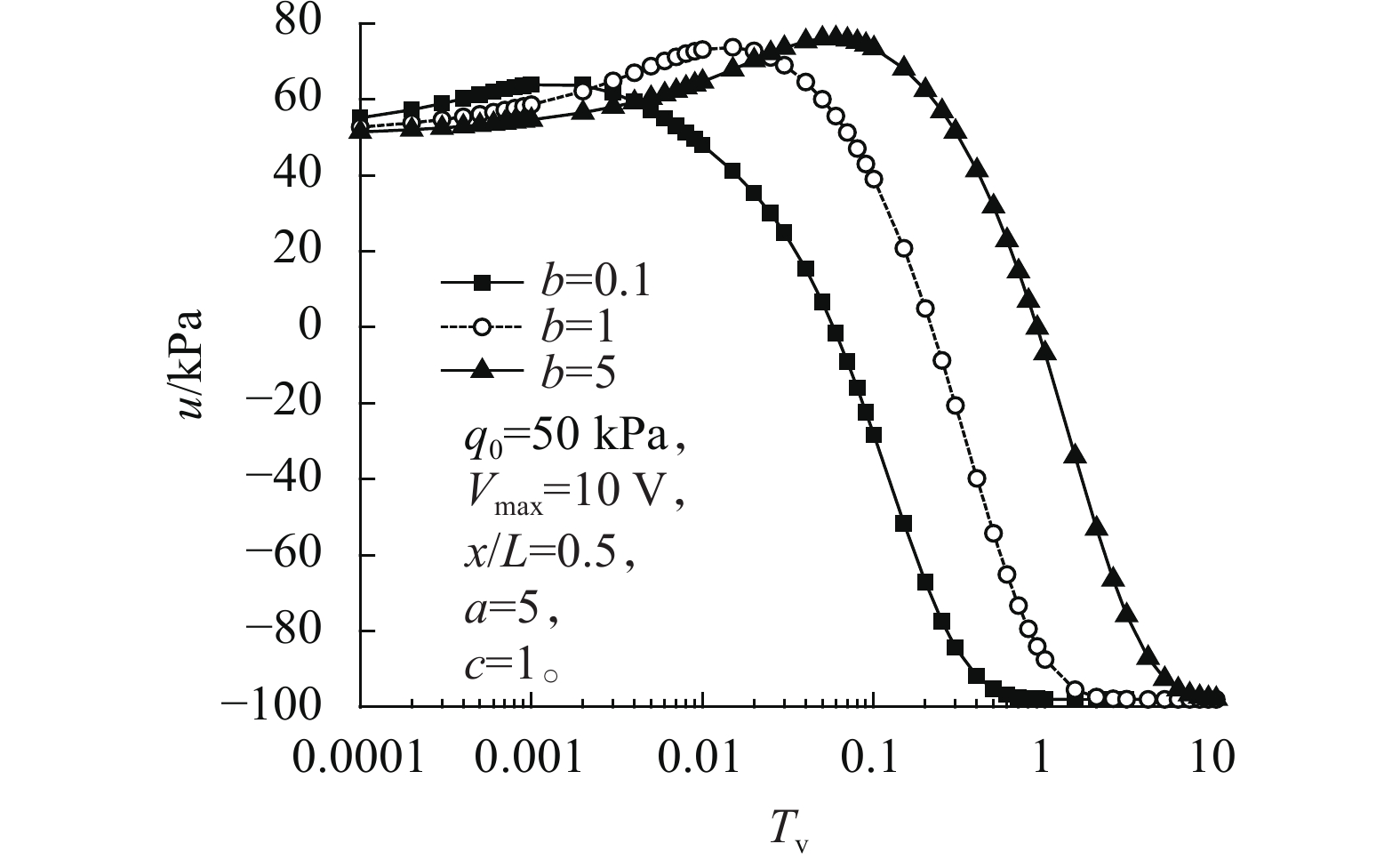 2)电渗作用下,a>1时,相对压缩性参数b值越大,超静孔隙水压力上升幅度越大,超静孔隙水压力最大值出现的时间越滞后。