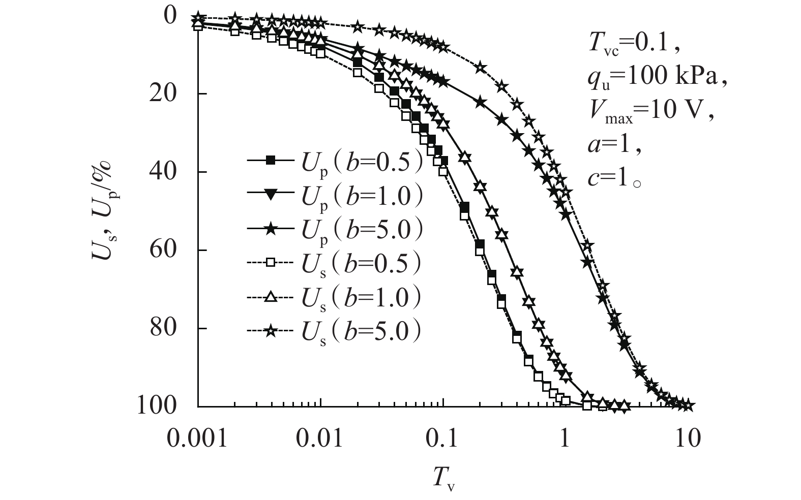 图9描述了固定荷载参数Tvc=0.1,qu=100 kPa,电源电压Vmax=10 V时,土层相对压缩性b值对双层地基平均固结度的影响。由式(47)和(48)可以看出:当b=1时,按沉降定义的平均固结度Us与按孔压定义的平均固结度Up相等;当b≠1时,按沉降定义的平均固结度与按孔压定义的平均固结度不再相等,原因是土体沉降与超静孔隙水压力的消散不同步。从图9中可以看出:当b>1时,按孔压定义的平均固结度大于按沉降定义的平均固结度,即孔隙水消散速率比地基沉降速率更快,并且两者区别主要在固结前期,固结后期两者相等;当b=1时,Us与Up完全相等;当b<1时,按沉降定义的平均固结度大于按孔压定义的平均固结度,但两者差别非常小。此外,Us和Up均随b值的增大而减小,说明减小下层土的压缩性有利于地基固结。