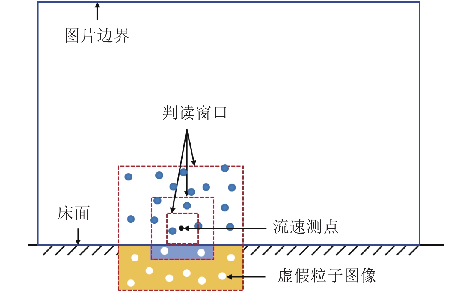 为利用PIV技术测量黏性底层内流速,使用宽高比较大的矩形判读窗口以提高垂直于床面方向的空间分辨率[19]。同时,为缩小测点与床面的最小距离,引入图1所示的虚拟窗口技术,该技术令测点与床面的最小距离为最小一级判读窗口高度的1/2。在对靠近床面的测点进行图像判读时,允许判读窗口延伸到图片边界之外,并在边界外的窗口内随机生成密度与实测图像一致且位移为零的虚假粒子图像,避免流速测量结果因窗口内图像分布不对称而产生显著偏差。后文分析时,判读窗口尺寸为32像素×16像素,窗口垂向重叠率为75%,测点距床面最小高度为8像素,测点垂向间距为4像素。