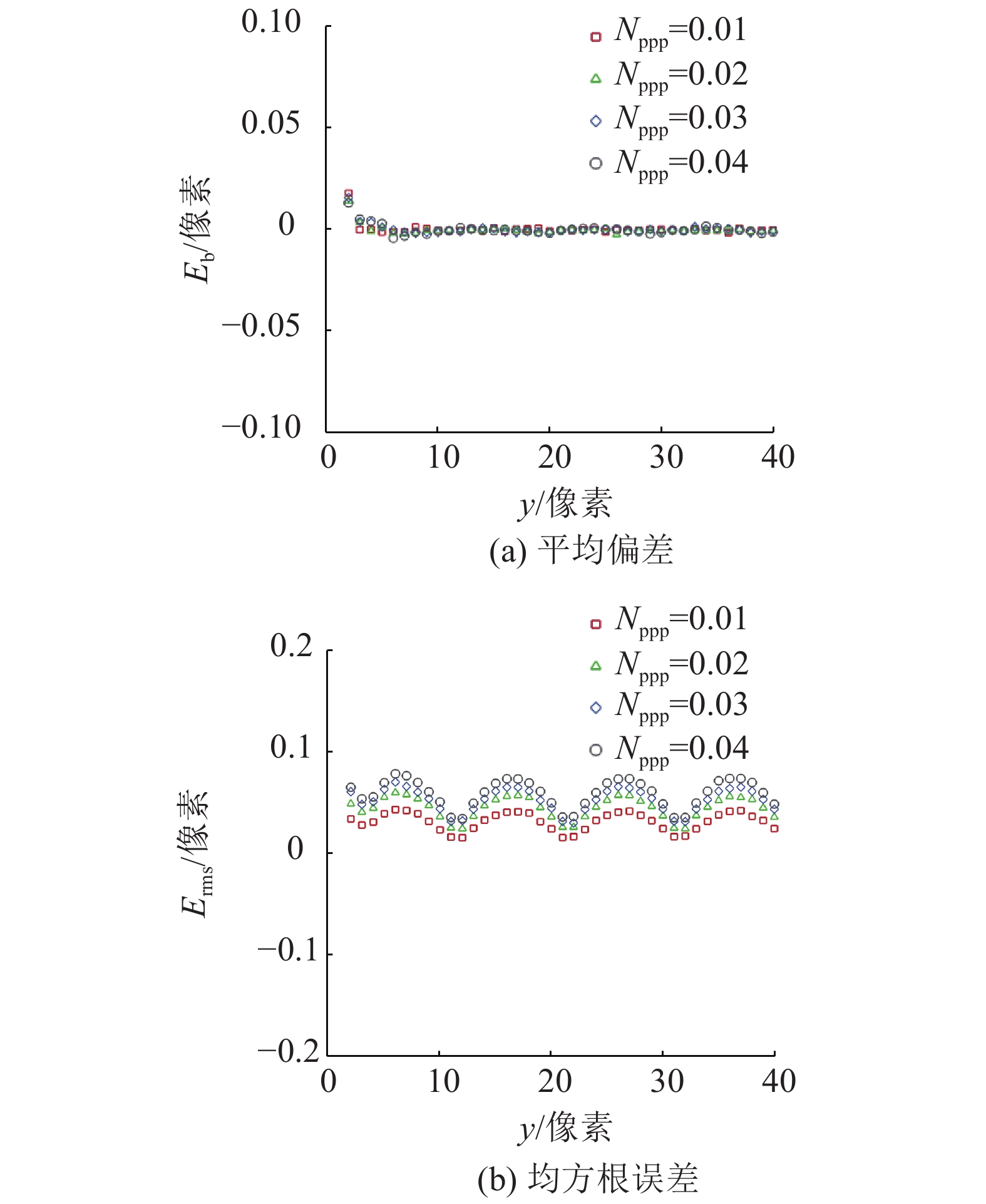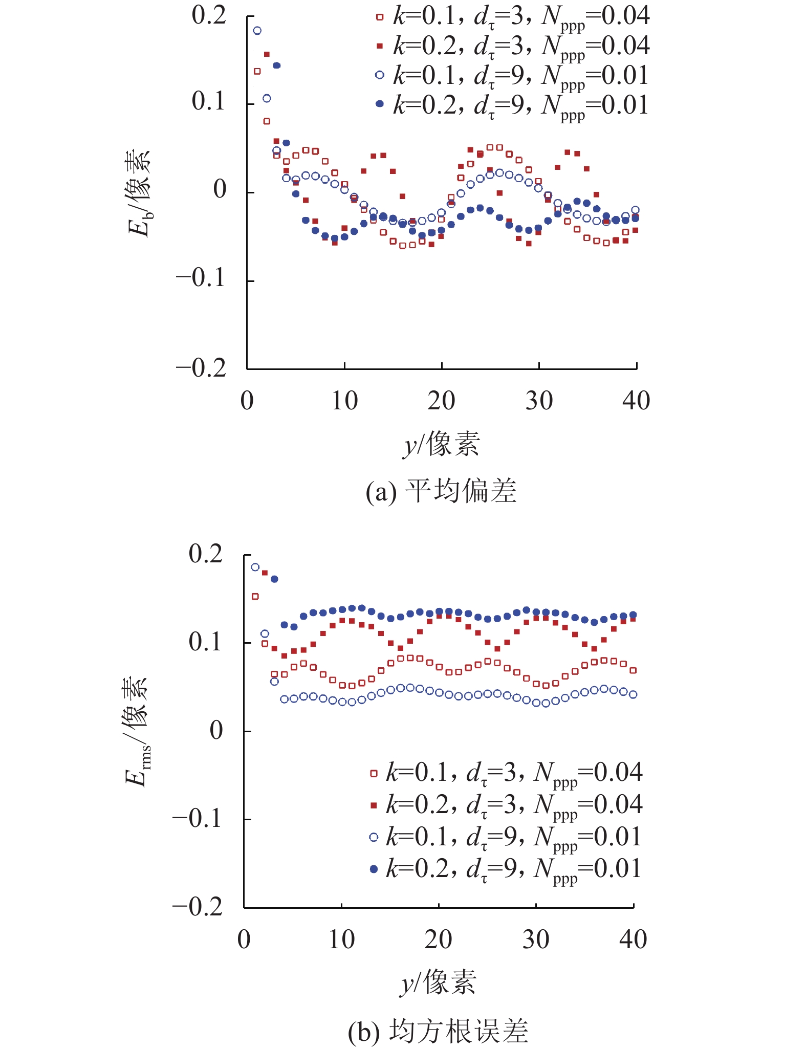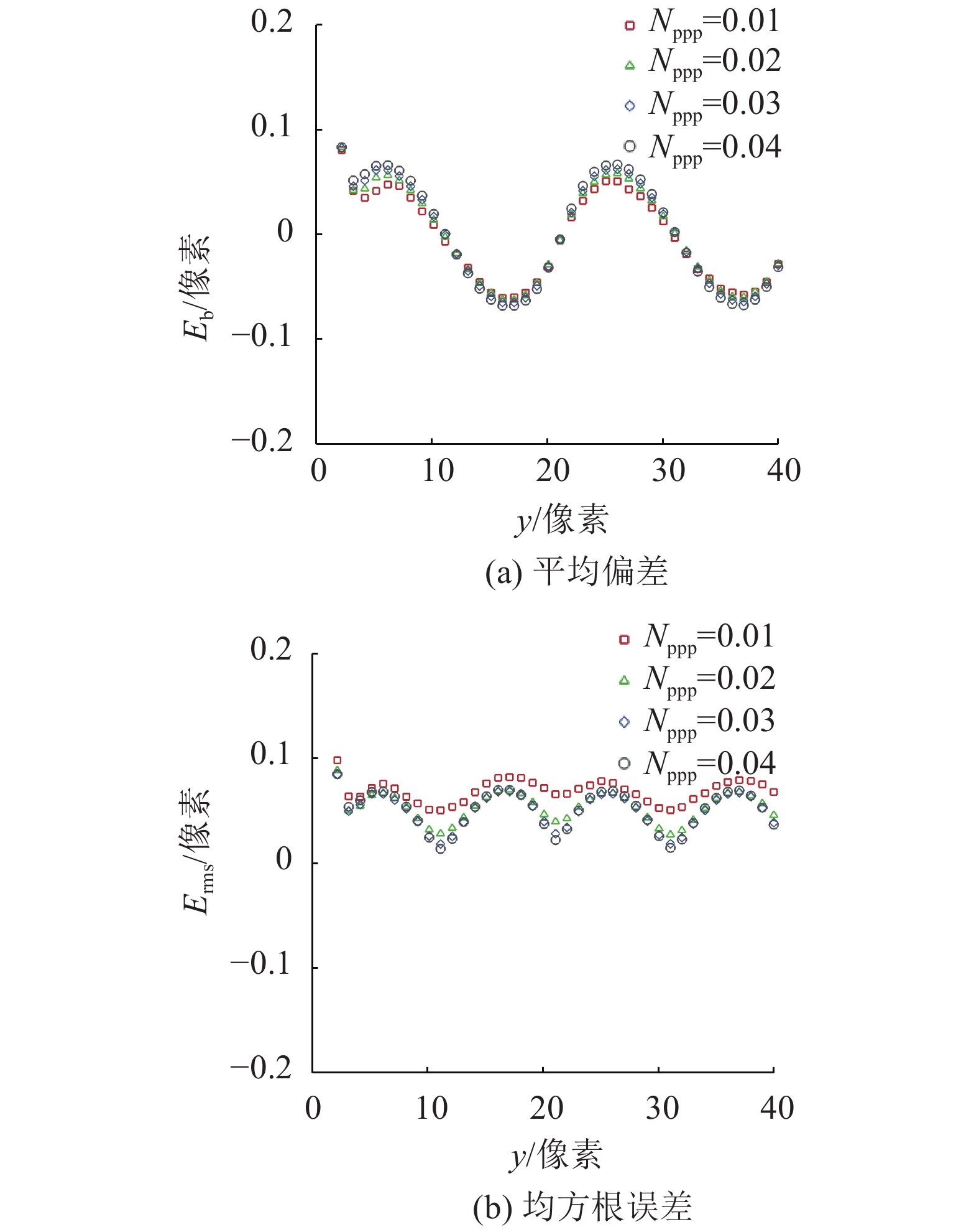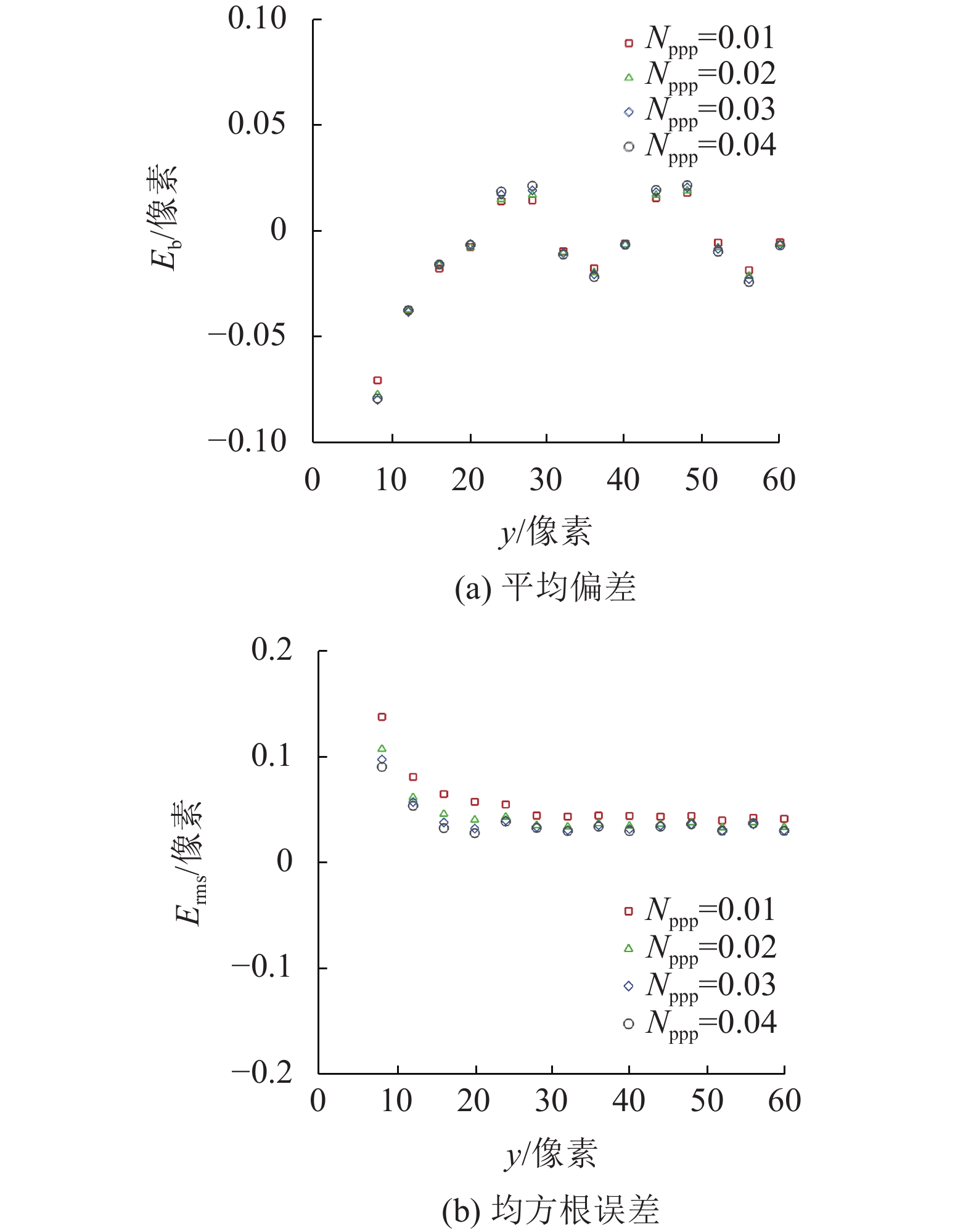 图2(a)中,平均偏差在远离床面区域沿垂向以20为周期正负交替,但基本不受粒子图像密度影响,各测次最大偏差值约±0.02像素。周期性偏差主要源于锁像素(pixel locking)现象,表现为测量值偏向整像素,与成像阶段粒子图像的像素化及图像判读阶段互相关函数的亚像素插值有关[27]。在距离床面约16像素(判读窗口高度)范围内,测量结果受床面影响而偏小,且距床面越近偏差越明显,最大偏差约–0.08像素。负偏差的产生与虚拟窗口技术有关,该技术在判读窗口内加入速度为零的虚拟粒子,使窗口内粒子的平均位移小于实际位移;需指出,若床面附近不使用虚拟窗口技术,PIV测量结果将显著偏大。图2(b)中,各测次均方根误差在远离床面的区域沿垂向无变化,除Nppp=0.01组因不适于PIV技术而误差稍大外,其余测次的均方根误差约0.04像素。在靠近床面的区域,均方根误差受床面影响而显著增大,最大误差0.14像素,受床面影响高度约16像素。