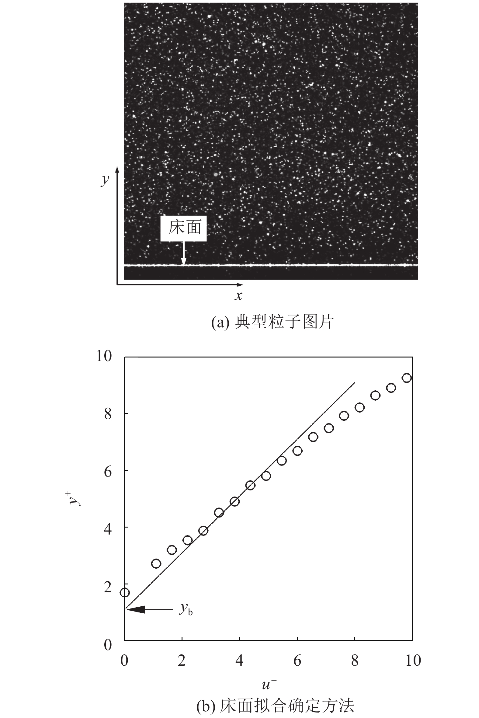 由式(2)可知,瞬时床面切应力的准确测量不仅需要高精度纵向流速分量,还需要确定床面位置以获得测点高度。床面在粒子图中的图案及其拟合确定方法如图11所示。图11(a)为一张典型粒子图片,图中底部白色亮带为示踪粒子在床面沉积后被激光照亮形成的图案,由于该亮带的宽度可达数像素,必须使用特殊处理方法才可以准确地确定床面位置。Kähler[11]及Nguyen[15]等曾分别提出从粒子图片中提取床面位置的数字图像处理方法,这些方法的精度在0.4~1.0像素之间,但对粒子图片成像条件有较高要求,难以普适应用。